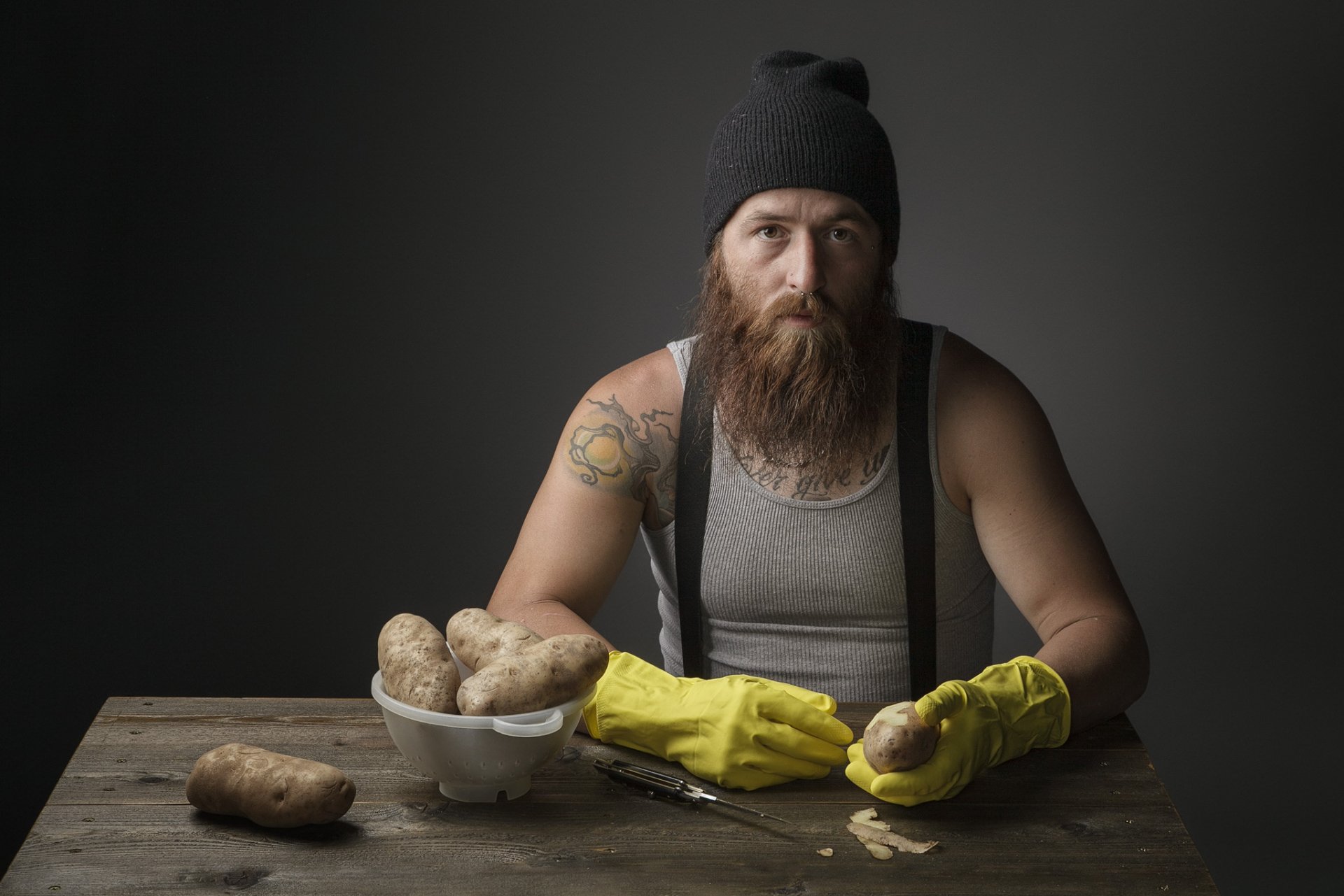 Un hombre con sombrero limpia un cortijo con un cuchilloUn hombre con sombrero limpia un Cortijo con un cuchillo
