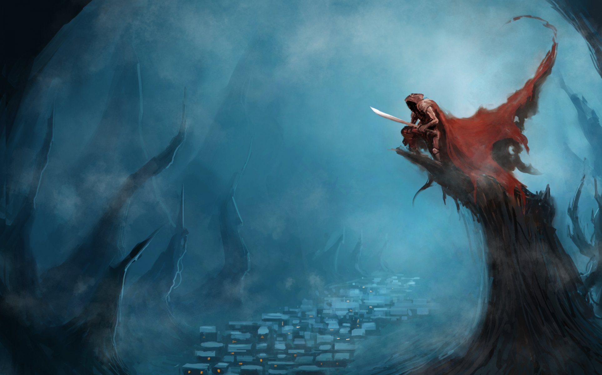 El hombre con un dragón cerca de un castillo con cascadasEl hombre con un dragón cerca de un castillo con cascadas