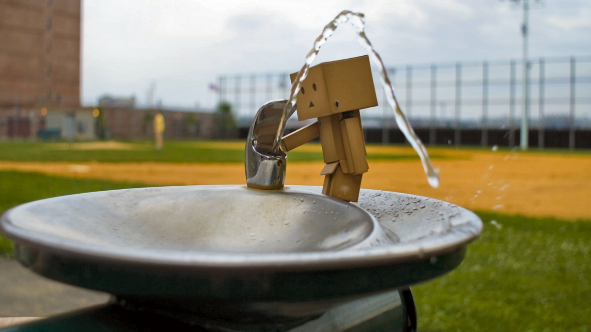 Un hombre de cartón se encuentra en una hoja de flor de agua