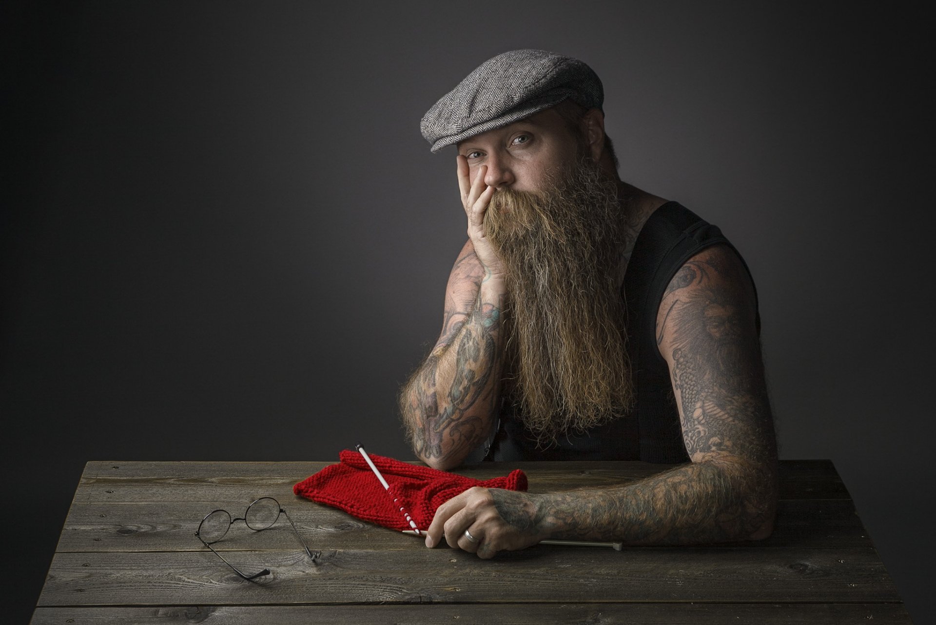Hombre con gorra y tatuajes se sienta con tejido de puntoHombre con gorra y tatuajes se sienta con tejido de punto