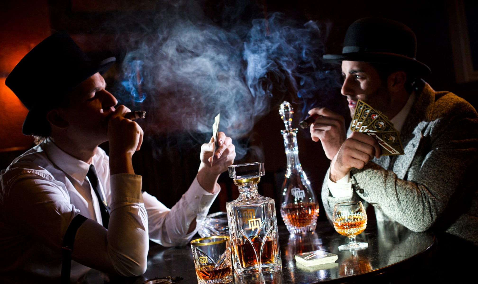 Dos hombres juegan a las cartas, fuman y beben en la mesaDos hombres juegan a las cartas, fuman y beben en la mesa