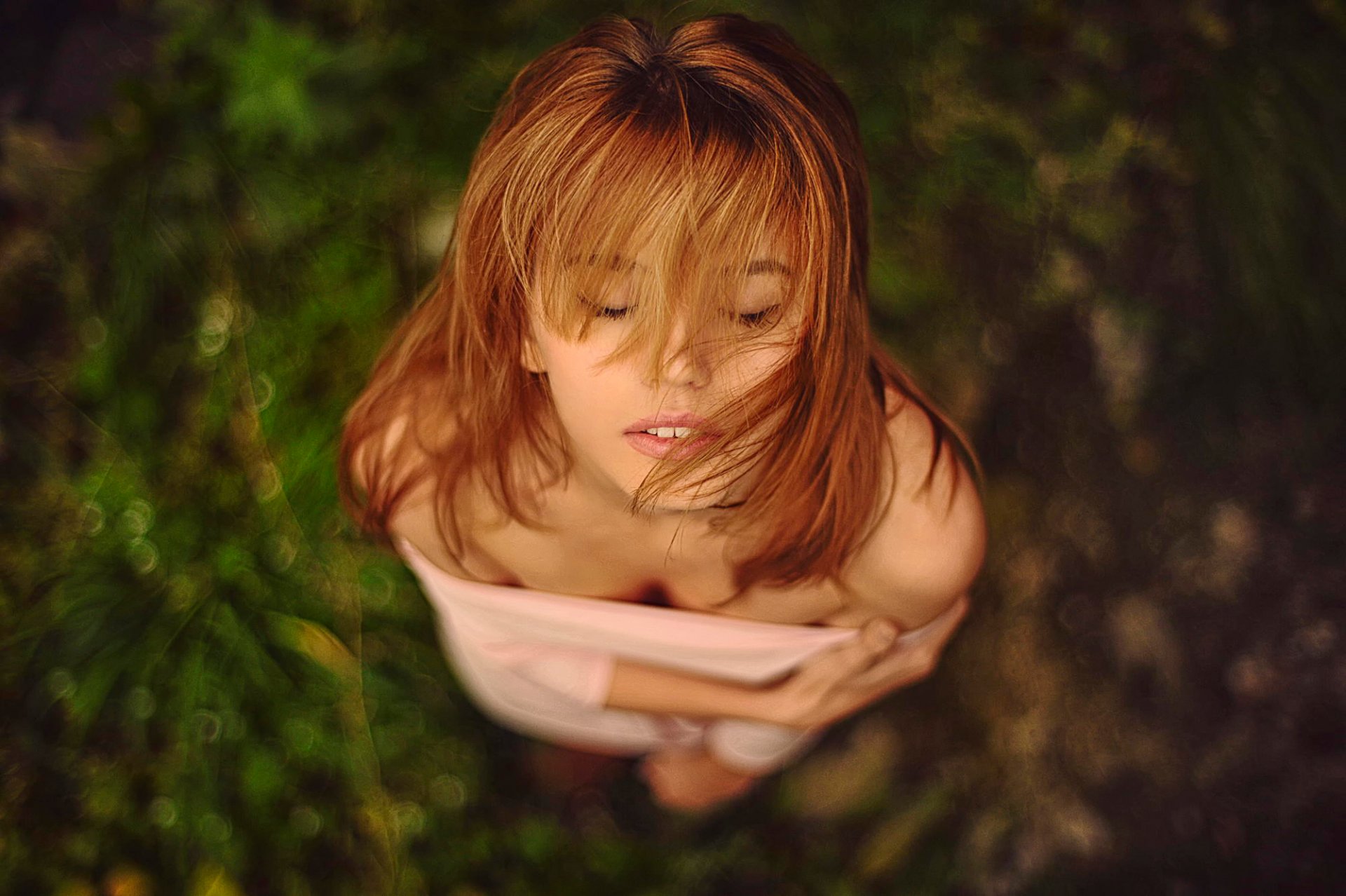Chica con el pelo rojo suelto y hombros descubiertosChica con el pelo rojo suelto y hombros descubiertos