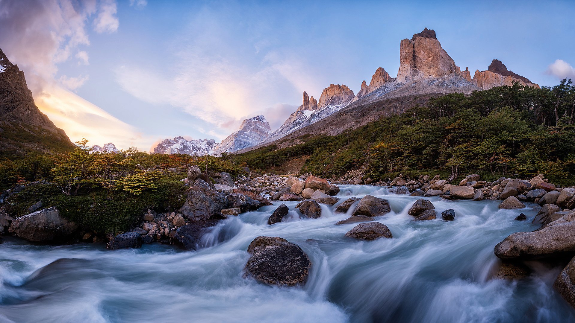 Isla con árboles altos rodeada de agua en el fondo de las cadenas montañosas