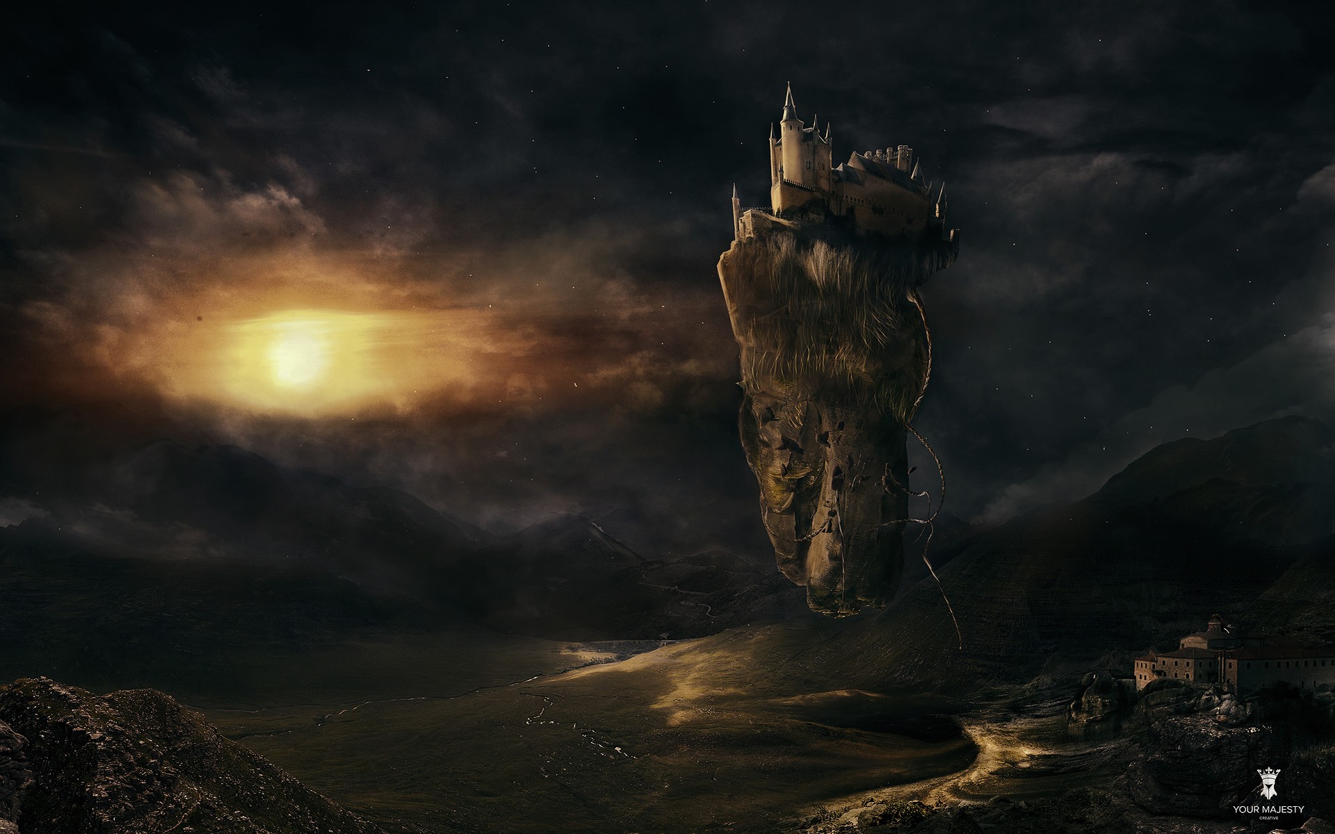 Castillo cerca de un acantilado en una isla en las nubesCastillo cerca de un acantilado en una isla en las nubes