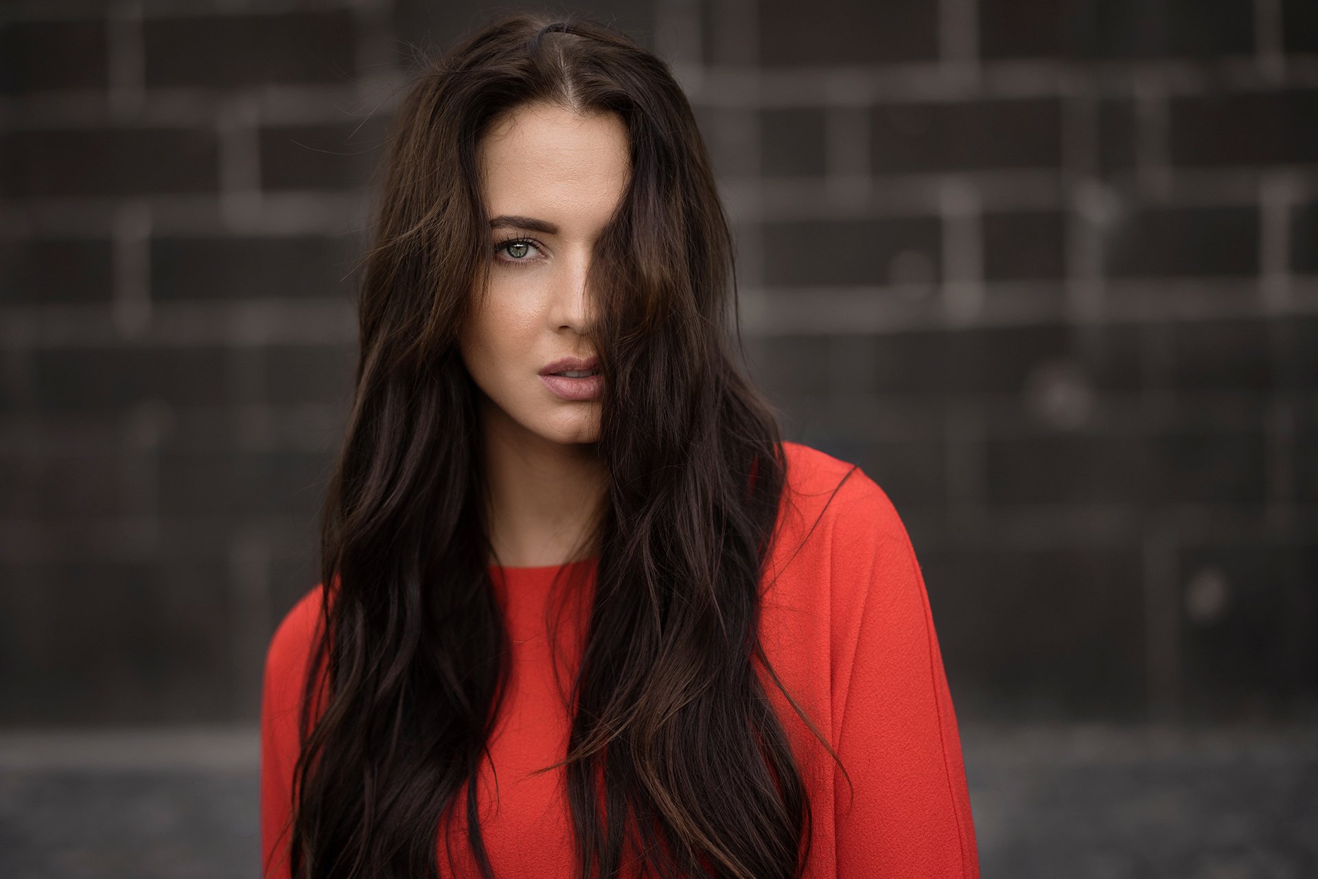 Hermosa foto de una chica en la calle a un Top rojo