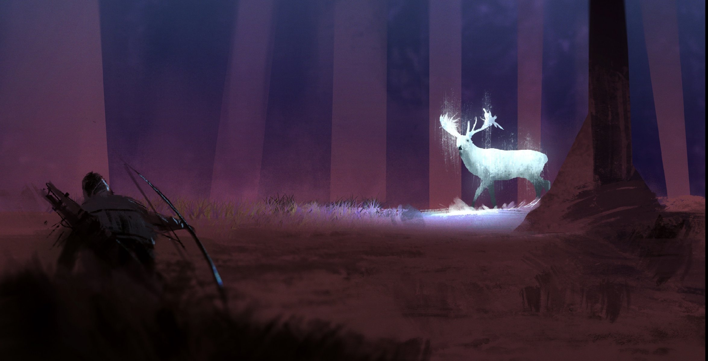 Un cazador observa a un ciervo en el bosque nocturnoUn cazador observa a un ciervo en el bosque nocturno