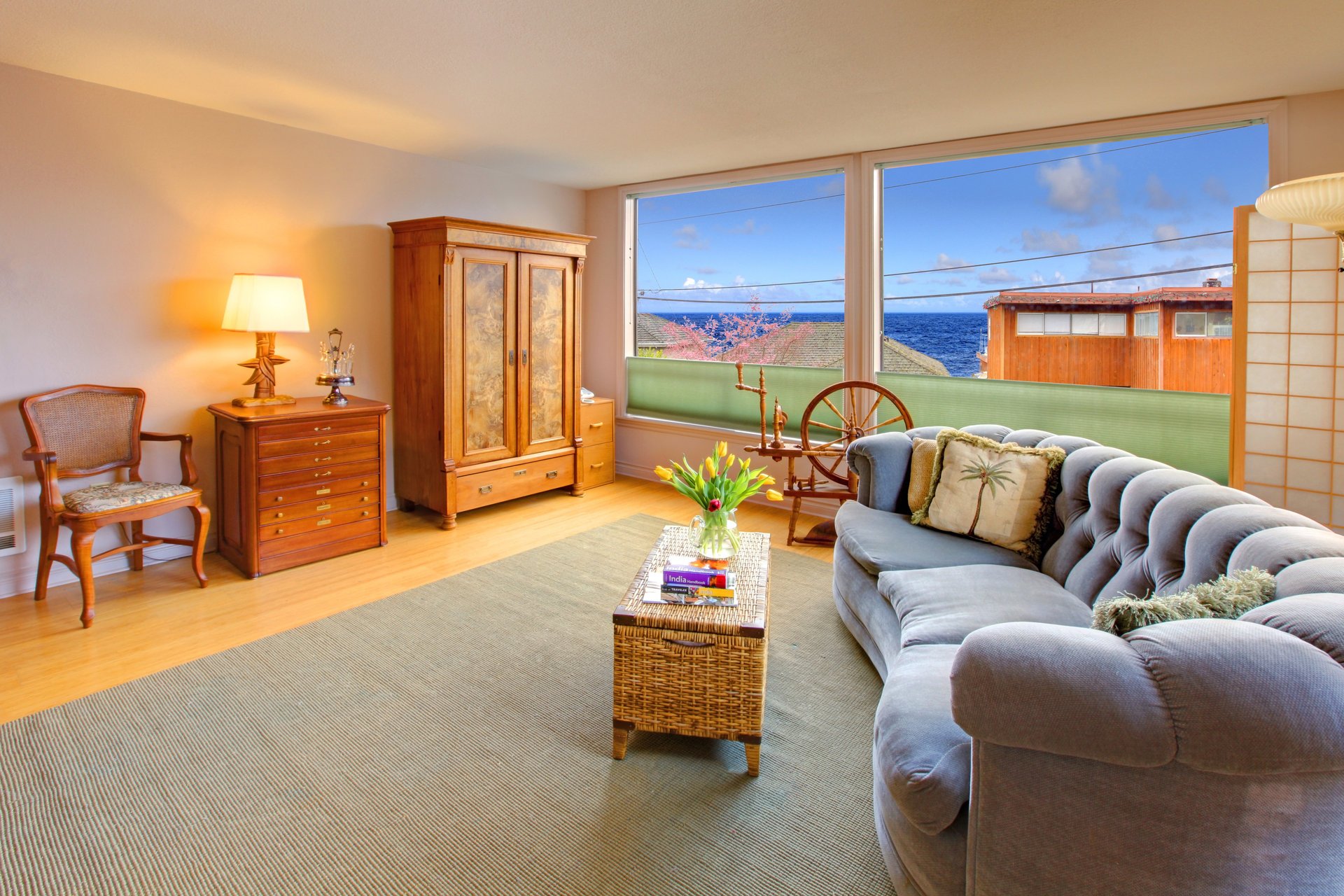 Amplia habitación con ventana panorámica y vistas al mar fuera de la ventanaAmplia habitación con ventana panorámica y vistas al mar fuera de la ventana