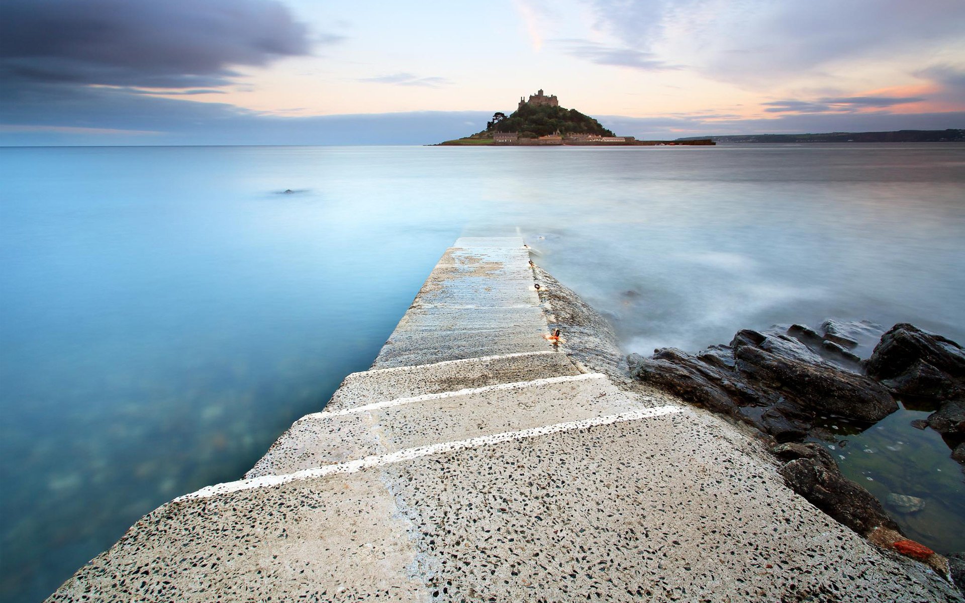 Camino de piedra que conduce al mar azul y la hermosa puesta de solCamino de piedra que conduce al mar azul y la hermosa puesta de sol