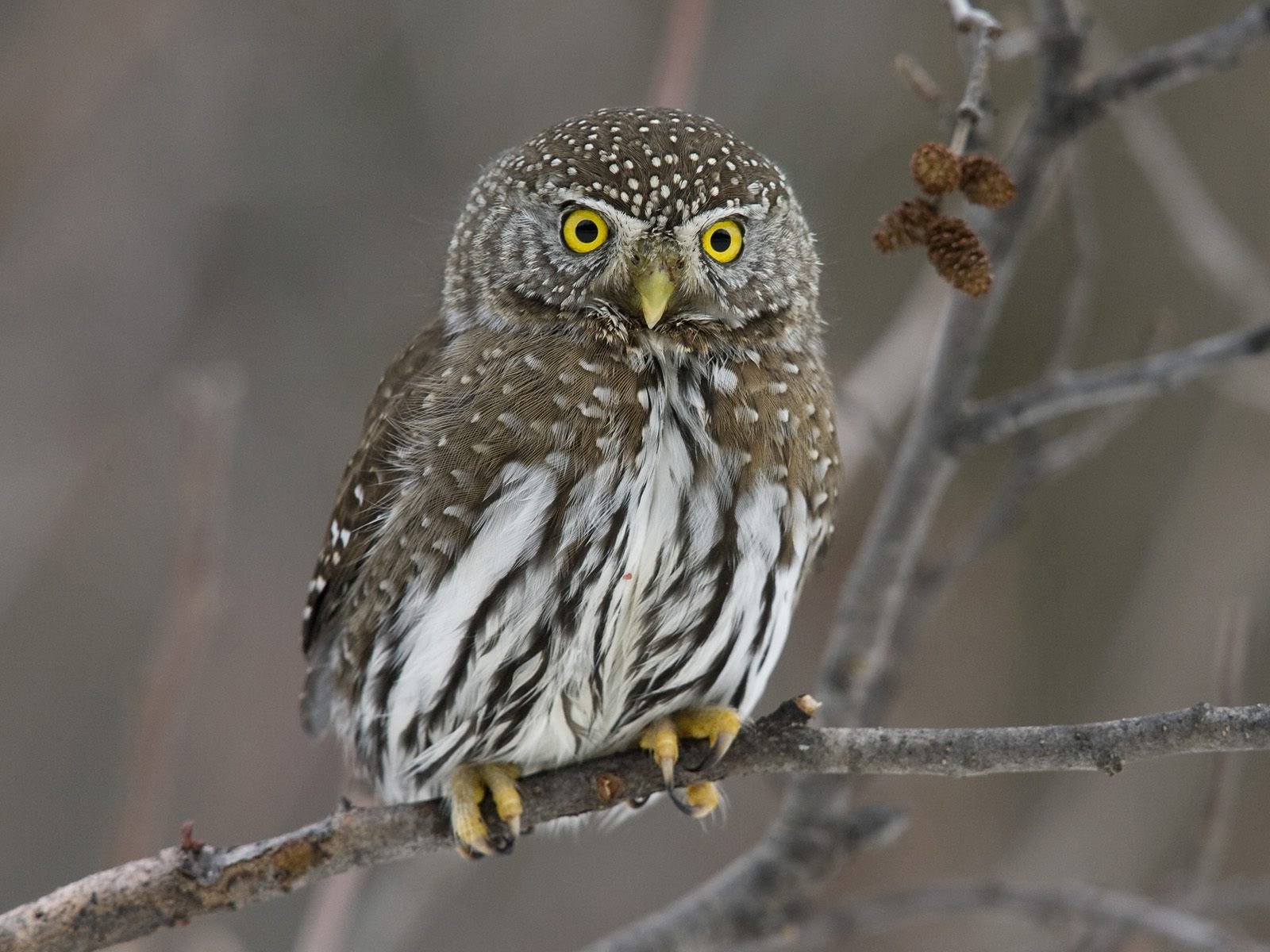 Búho sorprendido en el bosque de invierno