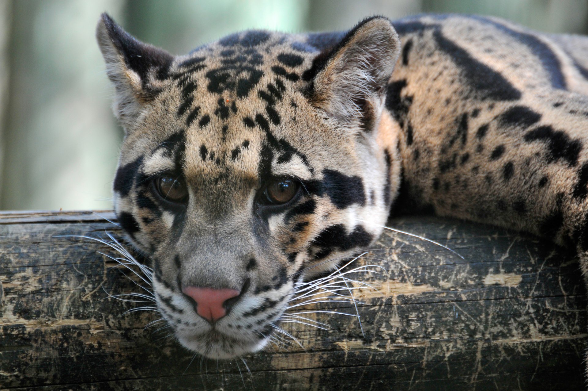 Leopardo yace con la cabeza apoyada en un árbol acostado