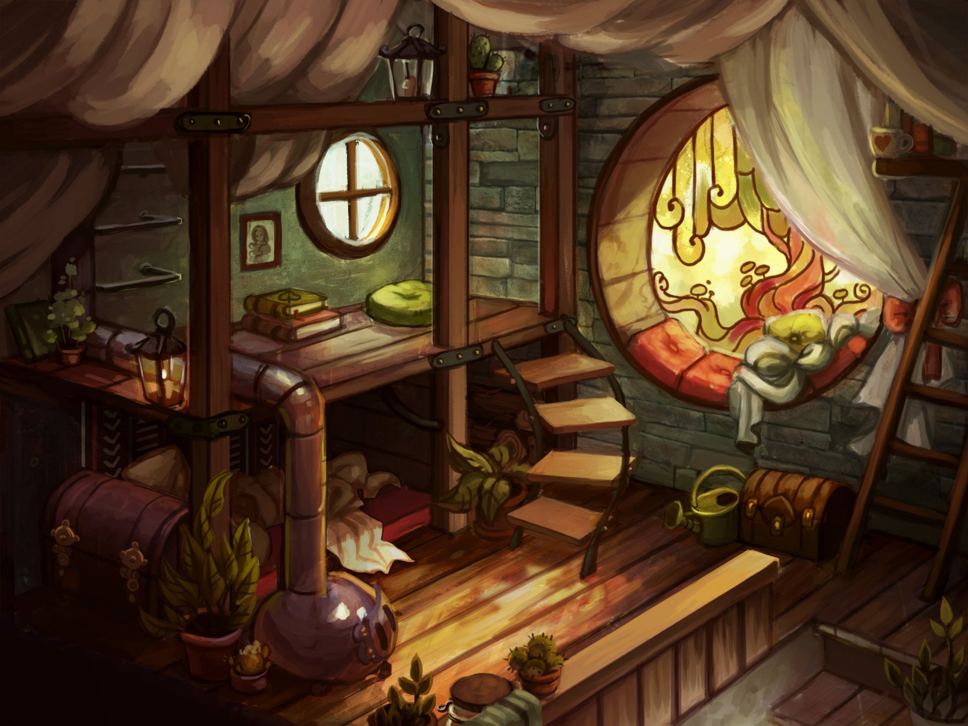 Dibujo de una habitación con vidrieras, cofres y una mesa con libros y una linternaDibujo de una habitación con vidrieras, cofres y una mesa con libros y una linterna