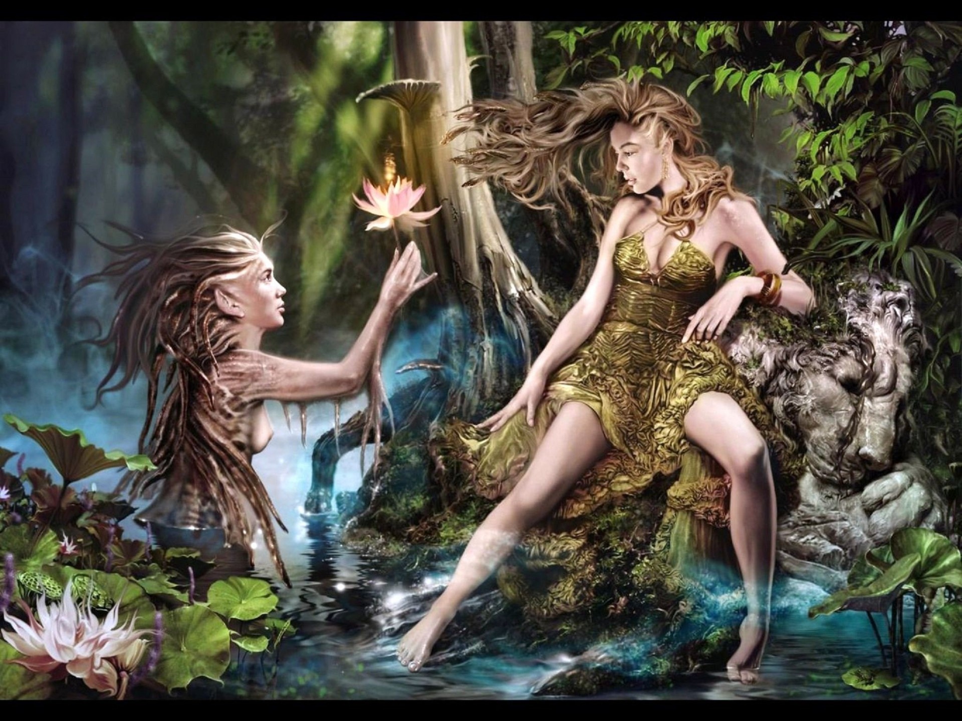 Dos chicas en el río con un lirio de agua en sus manos