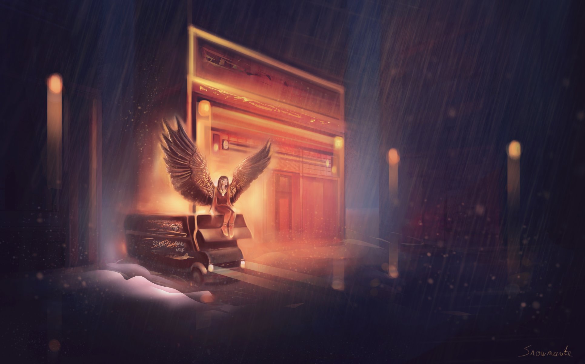 Arte chica con alas de ángel se sienta en un pioneer durante la lluviaArte chica con alas de ángel se sienta en un Pioneer durante la lluvia