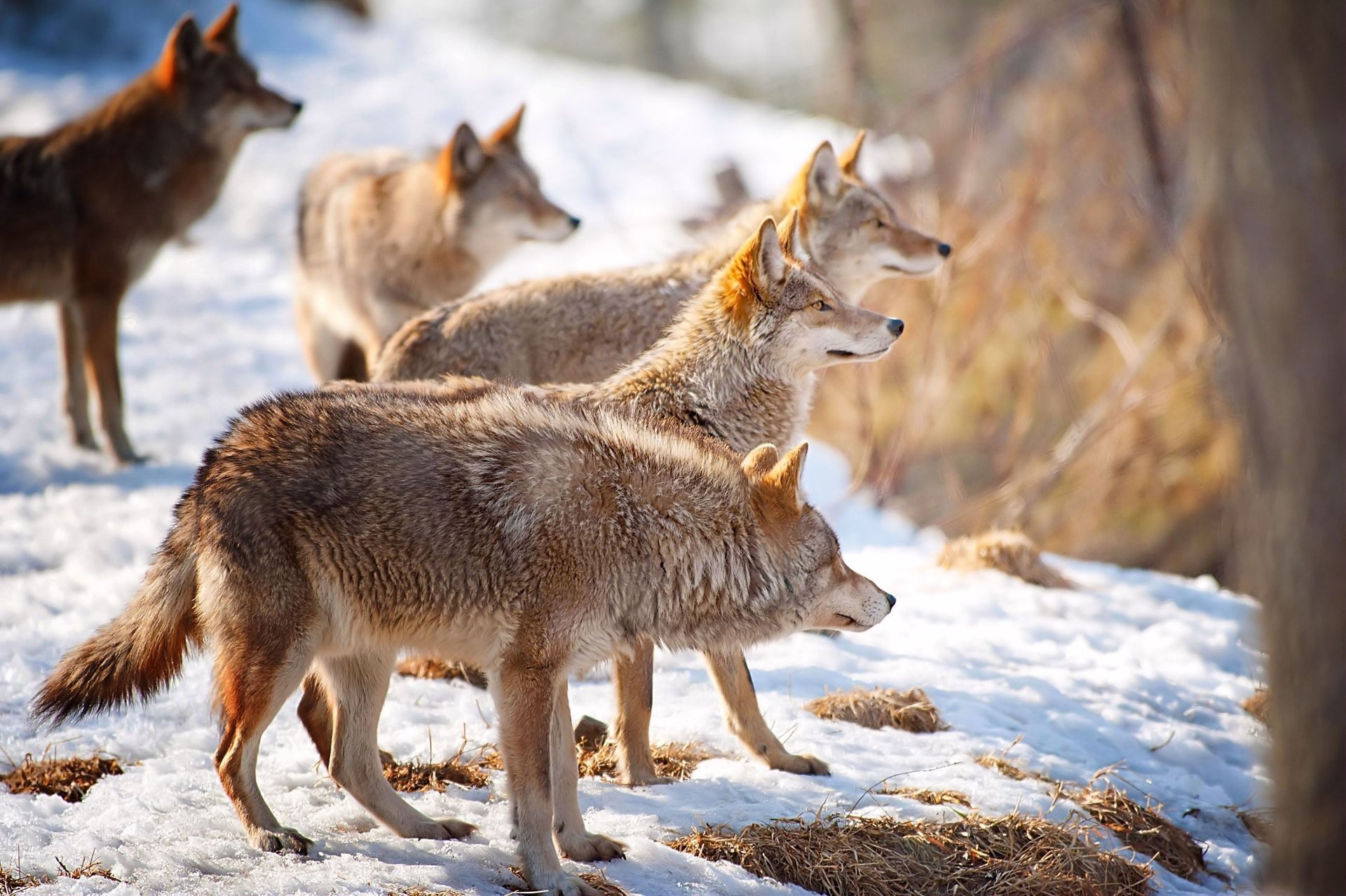 Manada de lobos en invierno en la nieve en el bosqueManada de lobos en invierno en la nieve en el bosque
