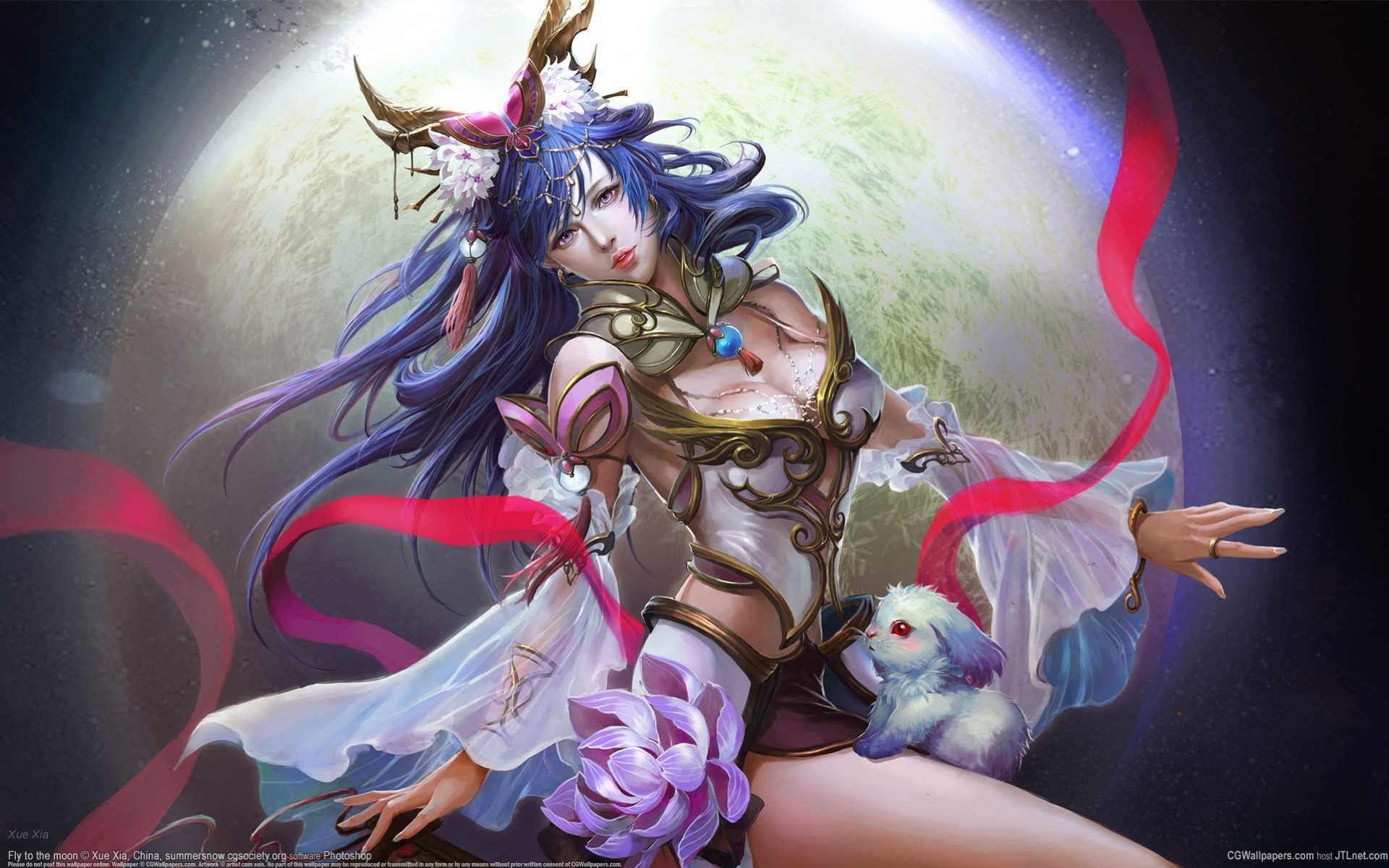 Chica con el pelo brillante en el fondo de la lunaChica con el pelo brillante en el fondo de la Luna