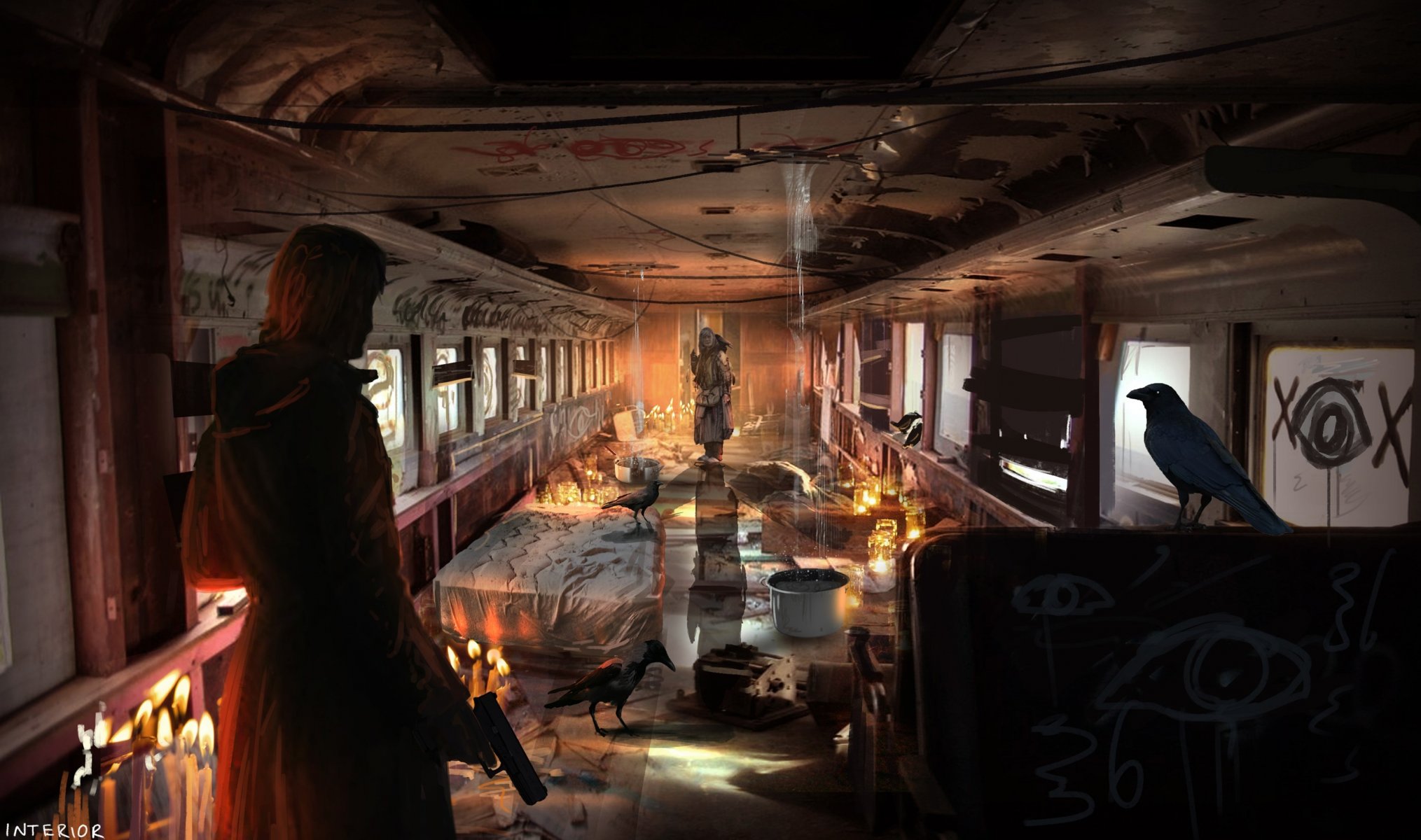 Un hombre con una pistola en una casa a la luz de las velas contra un fondo de cuervos y pájarosUn hombre con una pistola en una casa a la luz de las velas contra un fondo de cuervos y pájaros