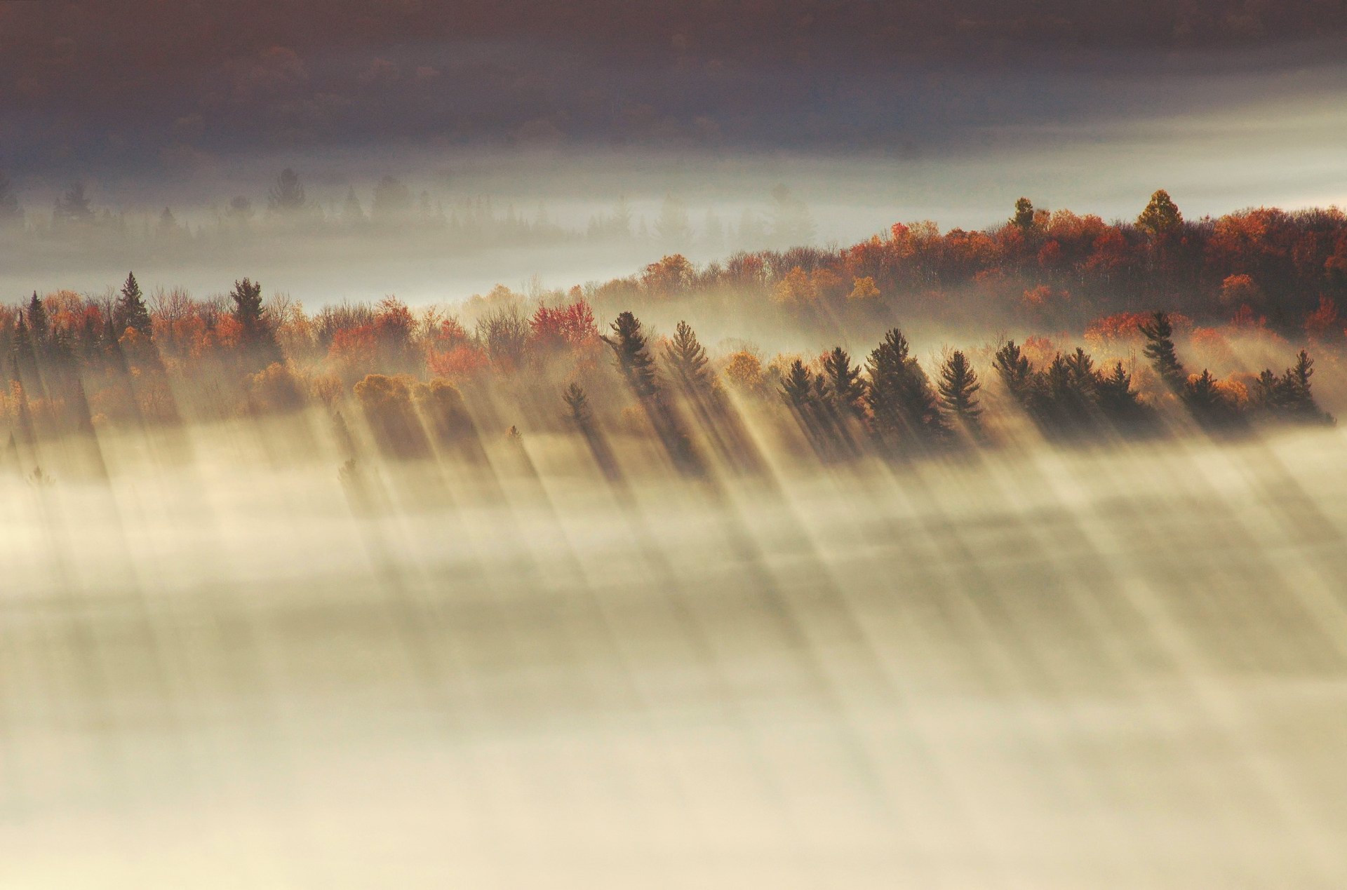 A través de las hojas de los árboles de otoño, los rayos de luz al atardecer son increíblesA través de las hojas de los árboles de otoño, los rayos de luz al atardecer son increíbles