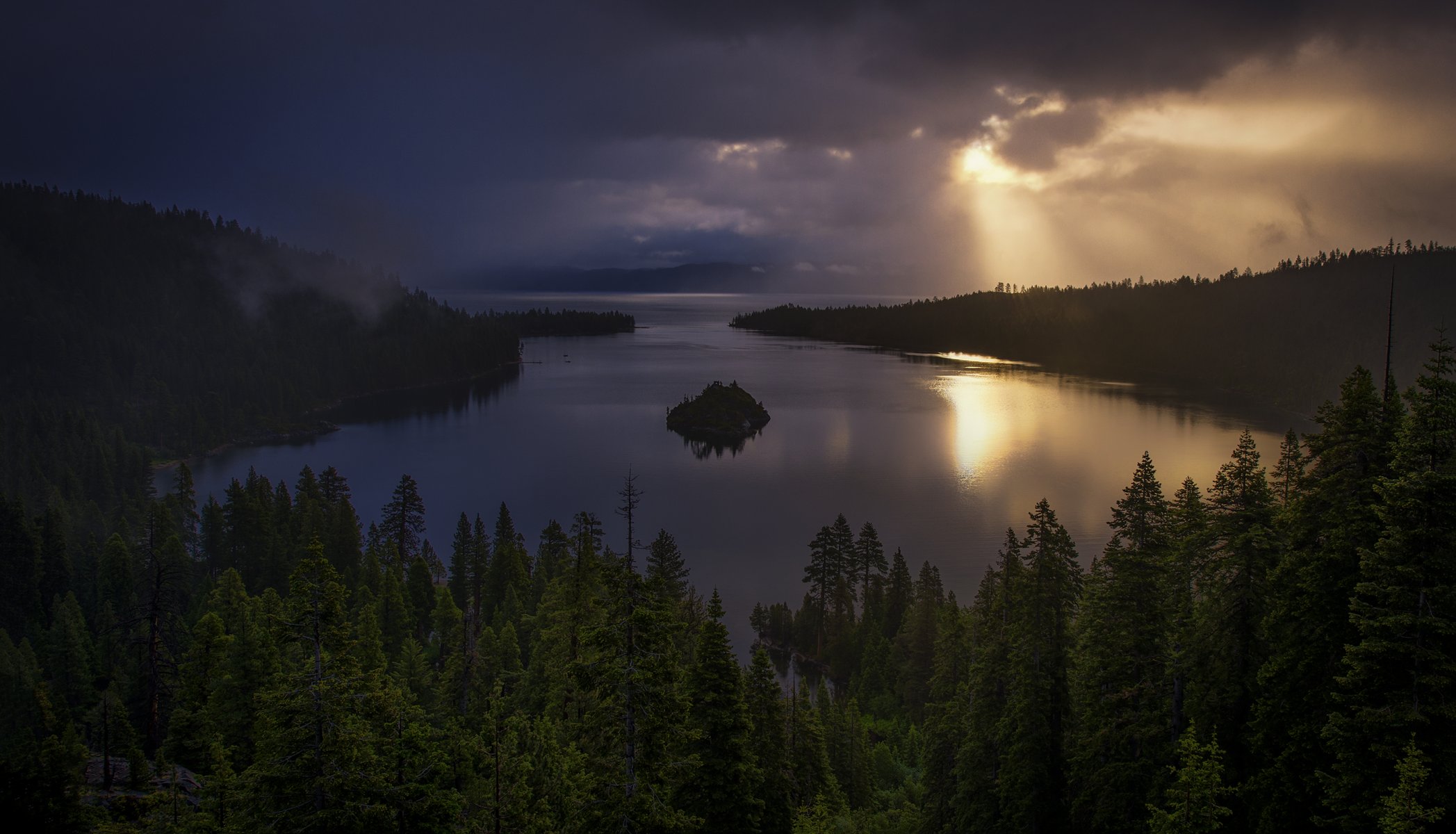 La luz del sol se abre paso a través de las nubes en la bahía del bosque