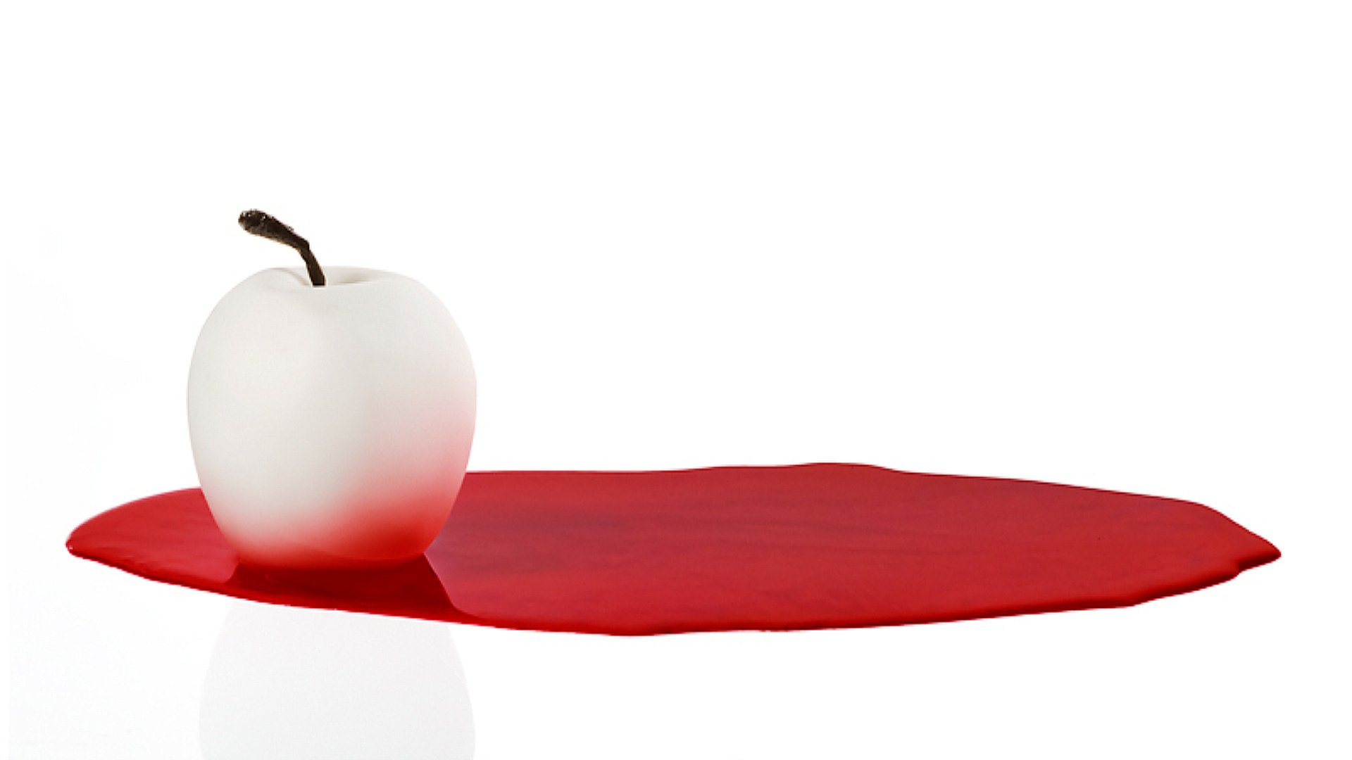 Manzana blanca sobre una mancha roja sobre un fondo claro