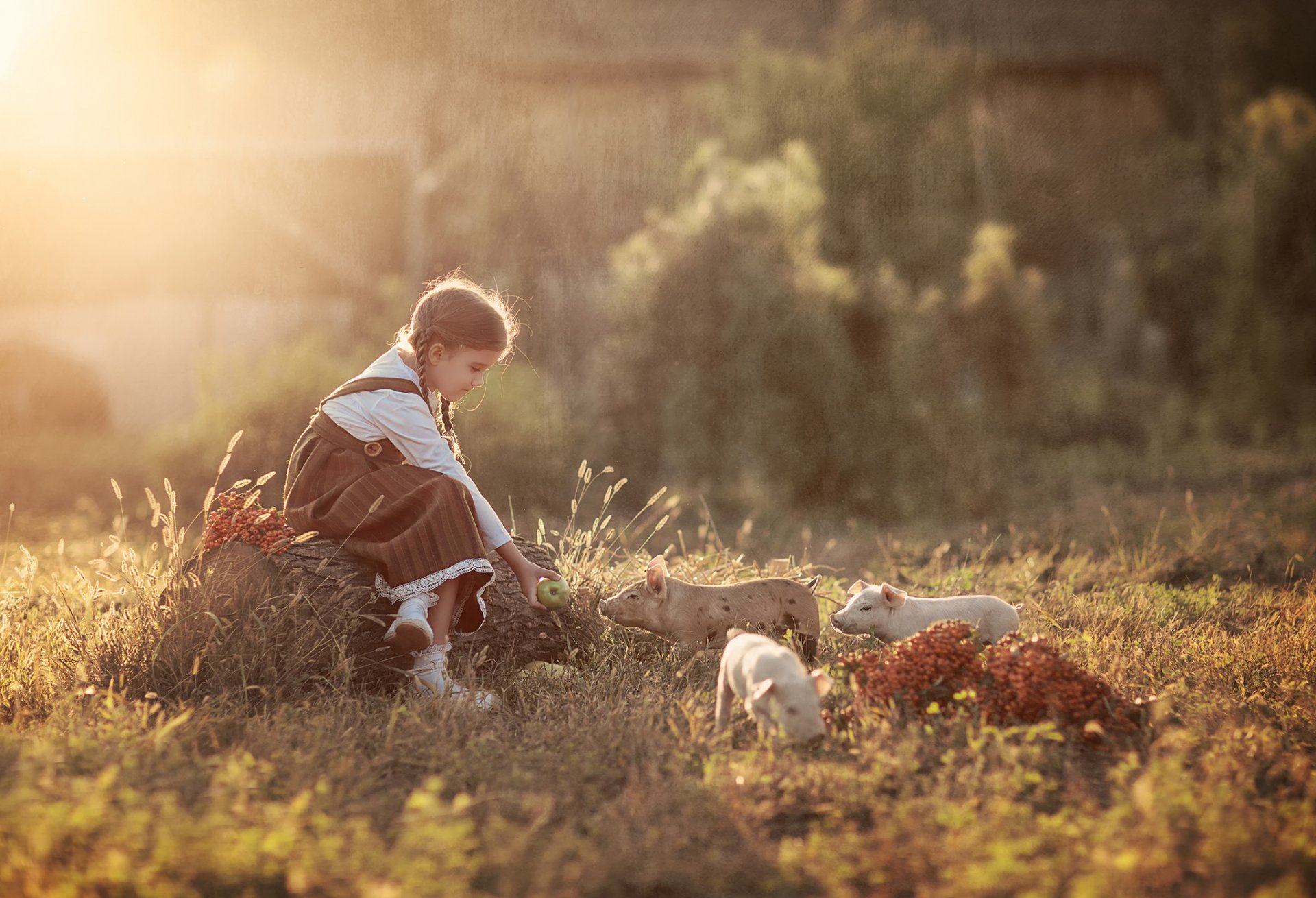 Una niña en un prado alimenta a los lechones con una manzanaUna niña en un Prado alimenta a los lechones con una manzana