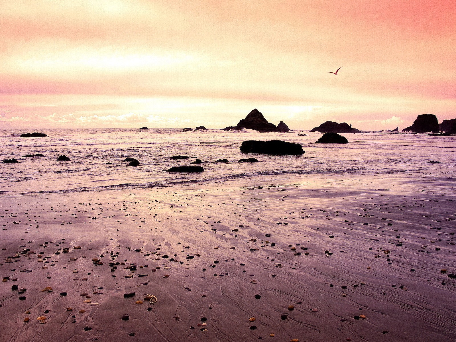 Marea alta en la playa. gaviota en vuelo en el horizonteMarea alta en la playa. Gaviota en vuelo en el horizonte