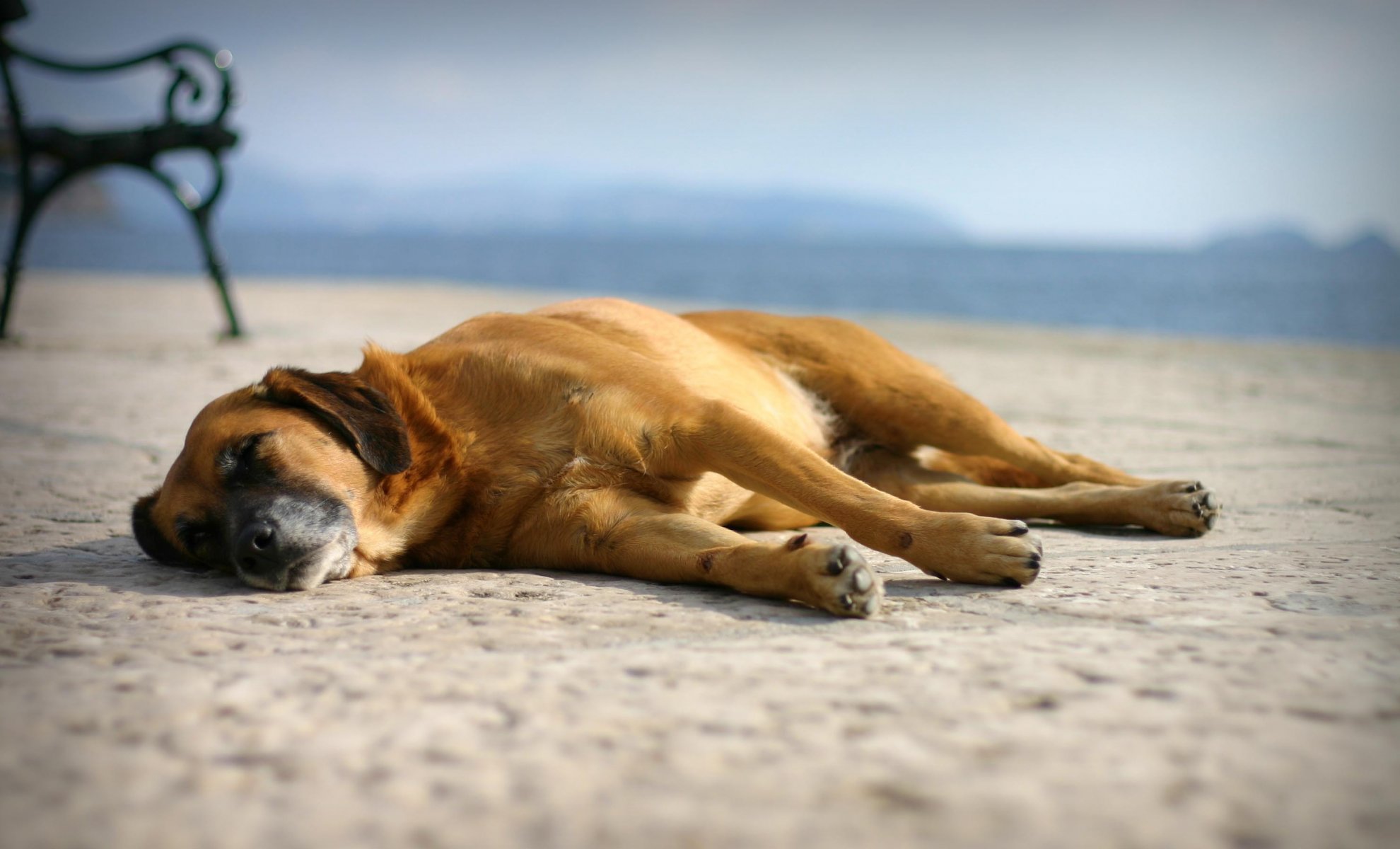 Perro tumbado en la arena en la playa, durmiendo y soñando