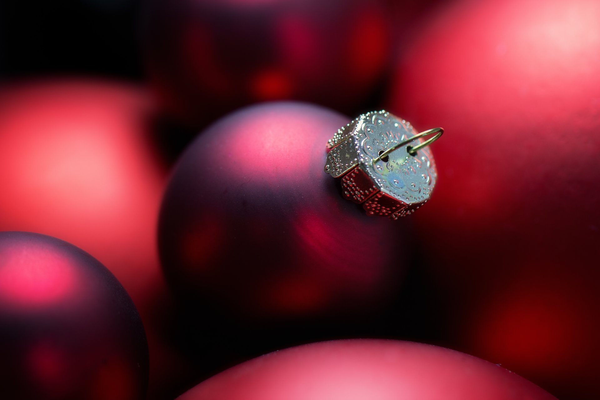 Tres grandes bolas rojas de navidad entre pequeñas plateadas