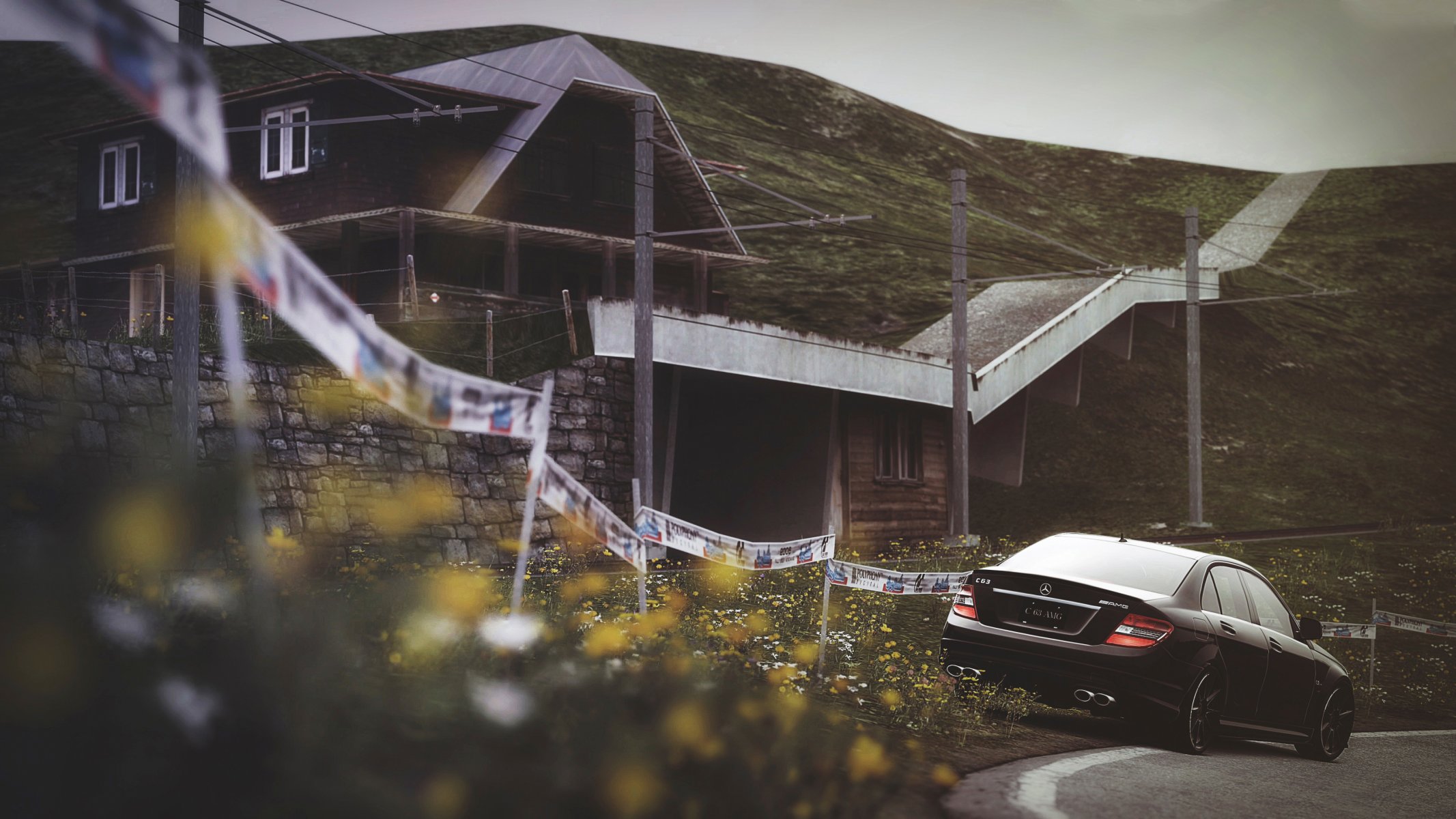 Hermosa puesta de sol en la ciudad. Mercedes rojo