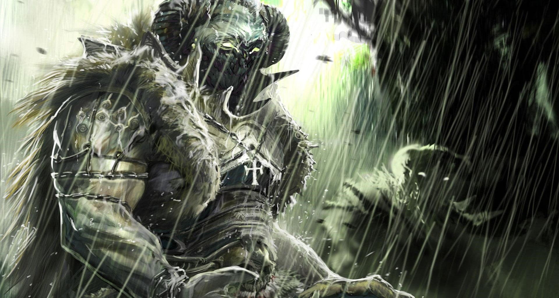 Un hombre con un paraguas camina sobre una cuerda bajo la lluvia