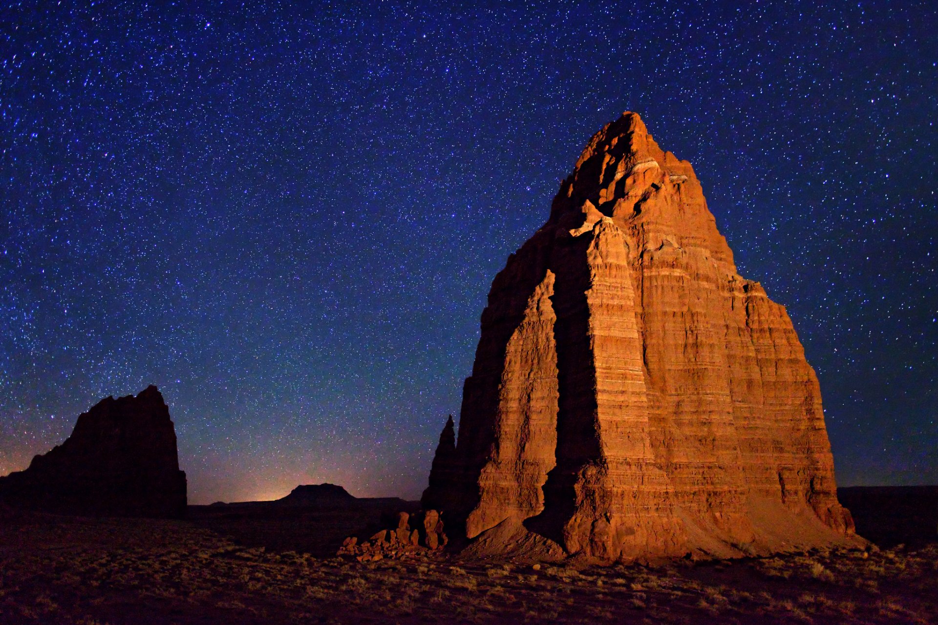 Hombre caminando por la ciudad de noche en las rocasHombre caminando por la ciudad de noche en las rocas