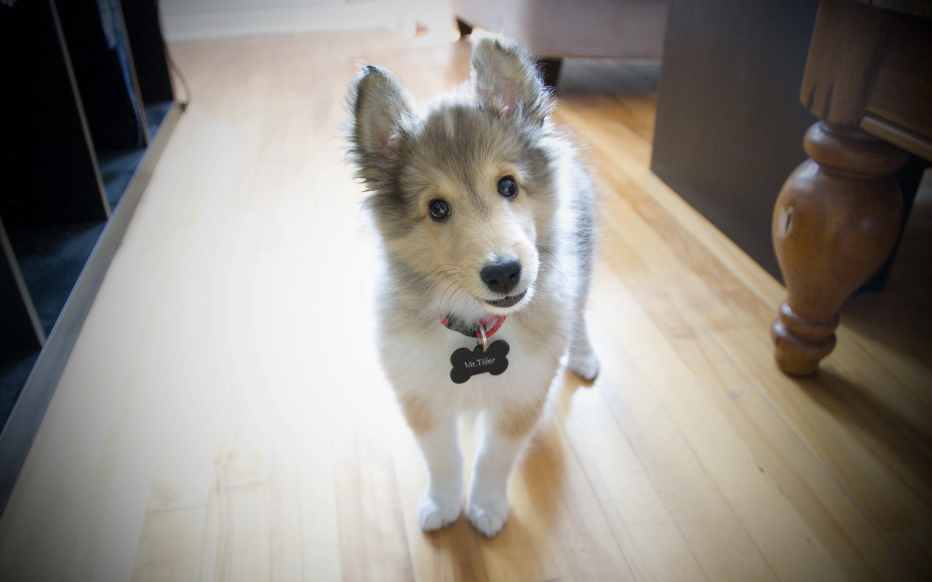 Una extraña mirada en un perro sobre un fondo grisUna extraña mirada en un perro sobre un fondo gris