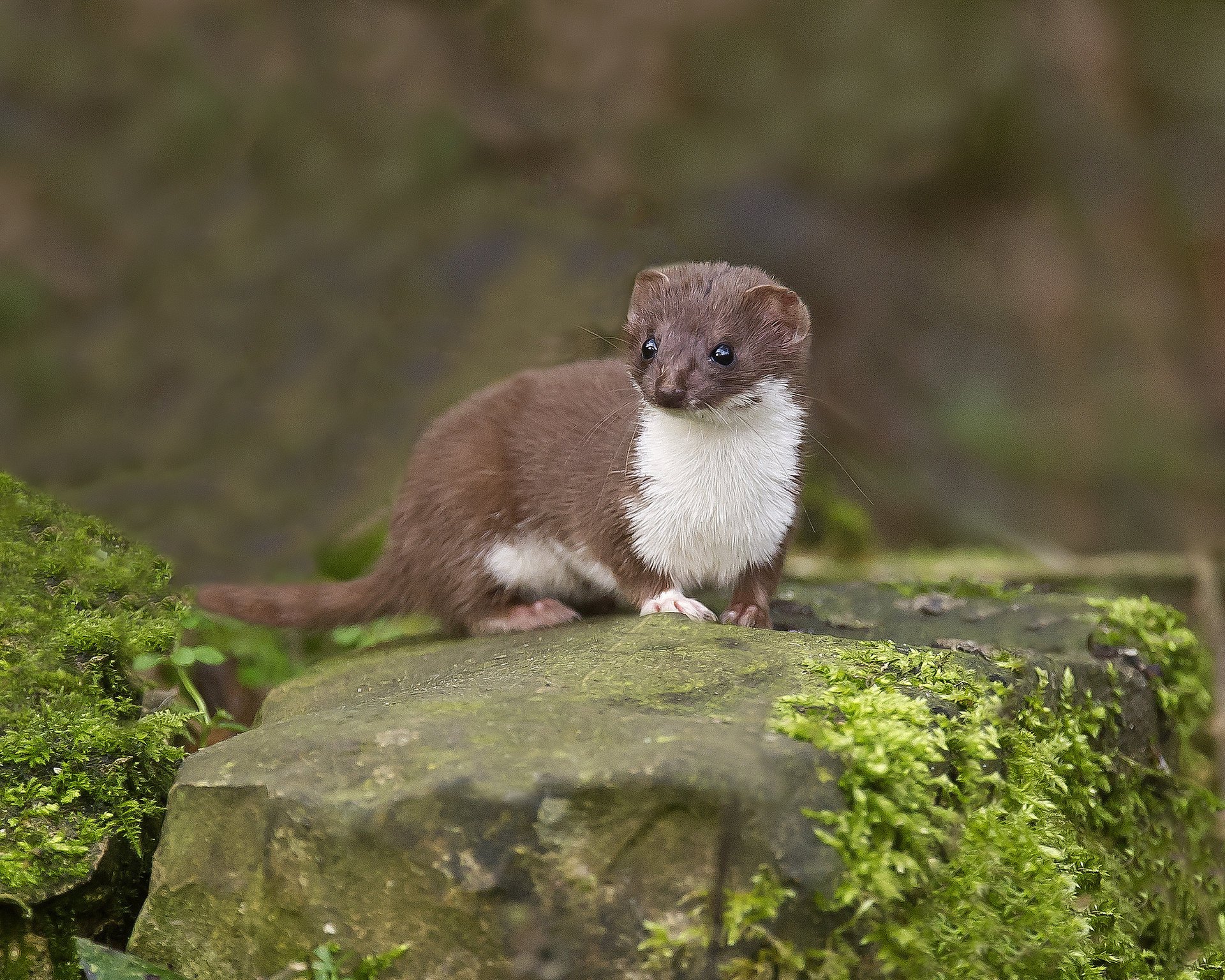 Armiño sentado en una piedra en el bosque
