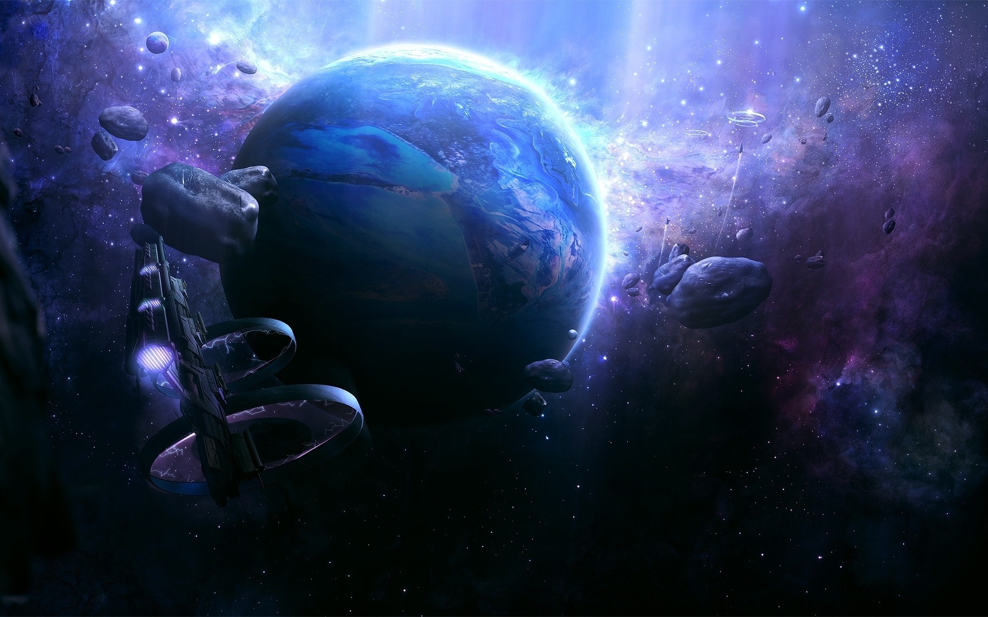 Un planeta rodeado de asteroides y una nave espacialUn planeta rodeado de asteroides y una nave espacial