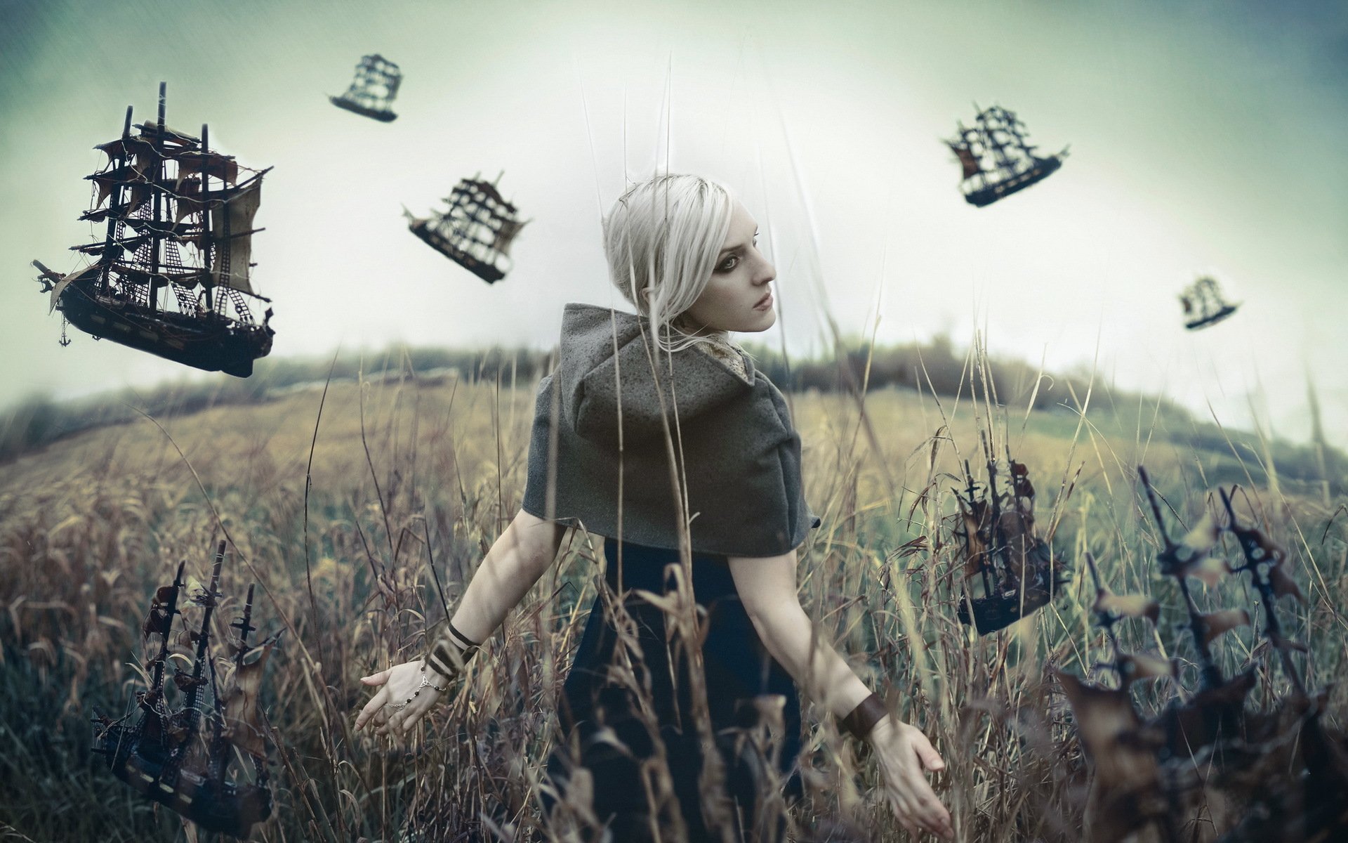 Una niña camina por el campo junto a las naves voladorasUna niña camina por el campo junto a las naves voladoras