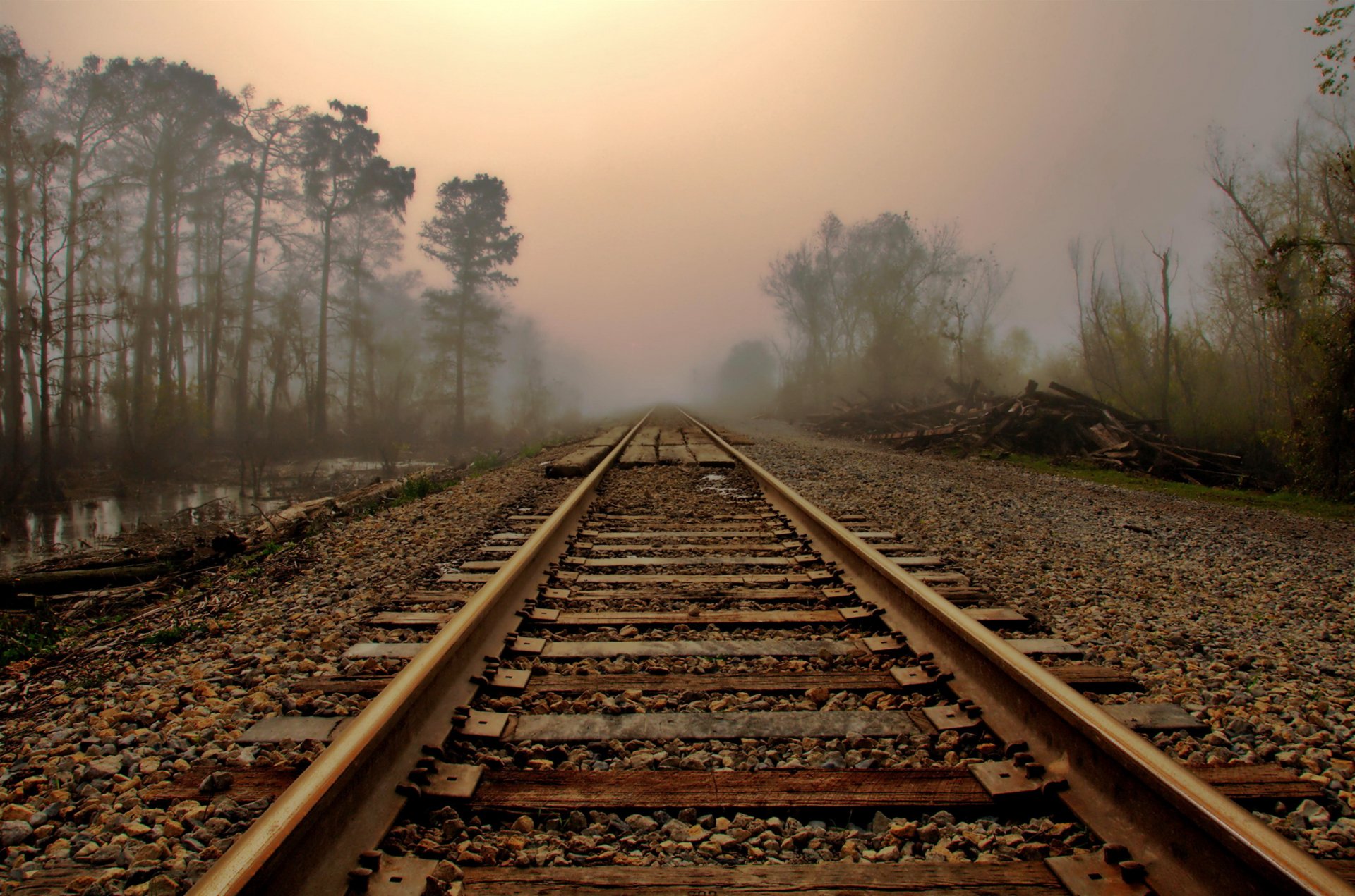 Rieles y camino a través del bosque en la niebla