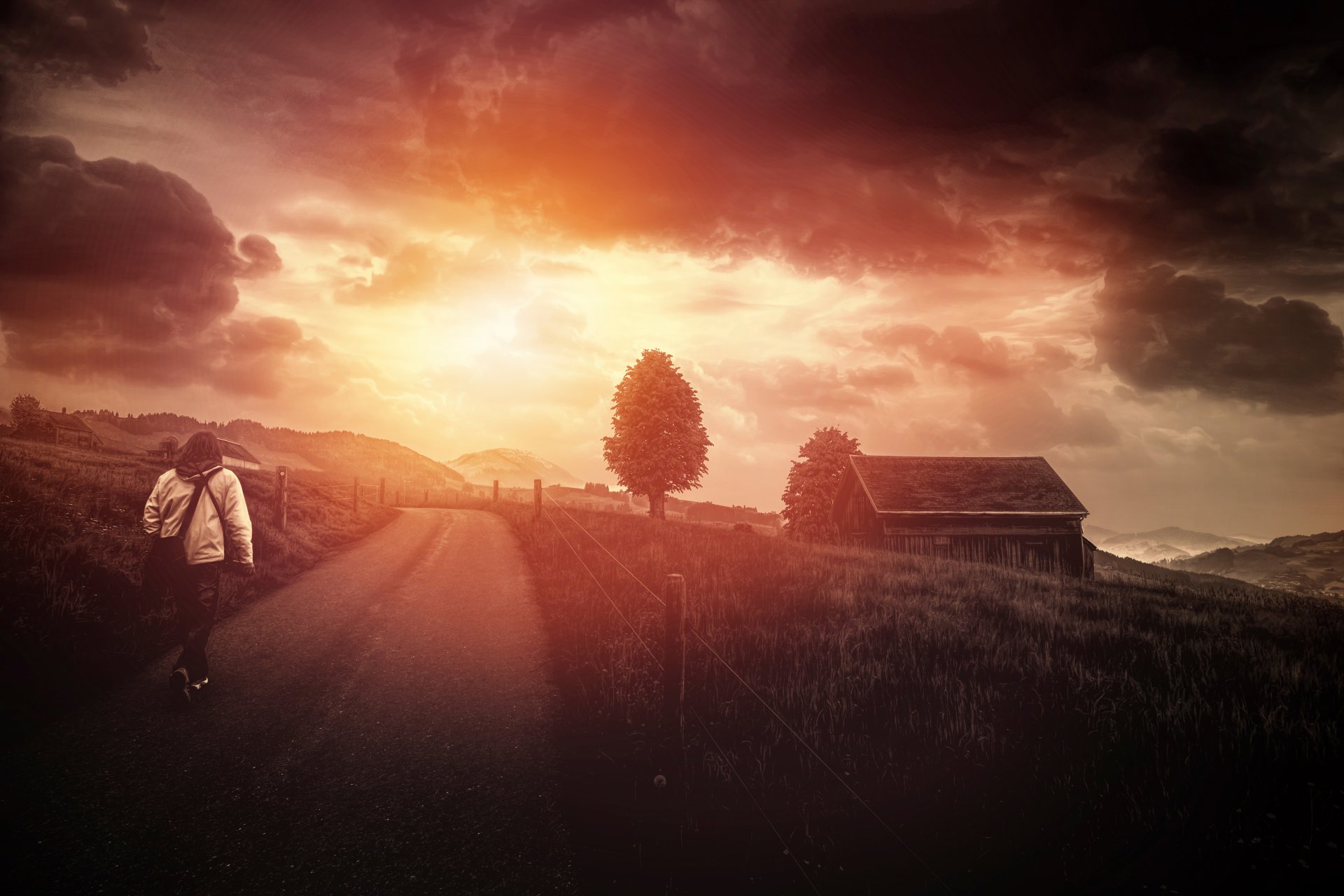 Un árbol cerca de la carretera. el camino conduce a las nubesUn árbol cerca de la carretera. El camino conduce a las nubes