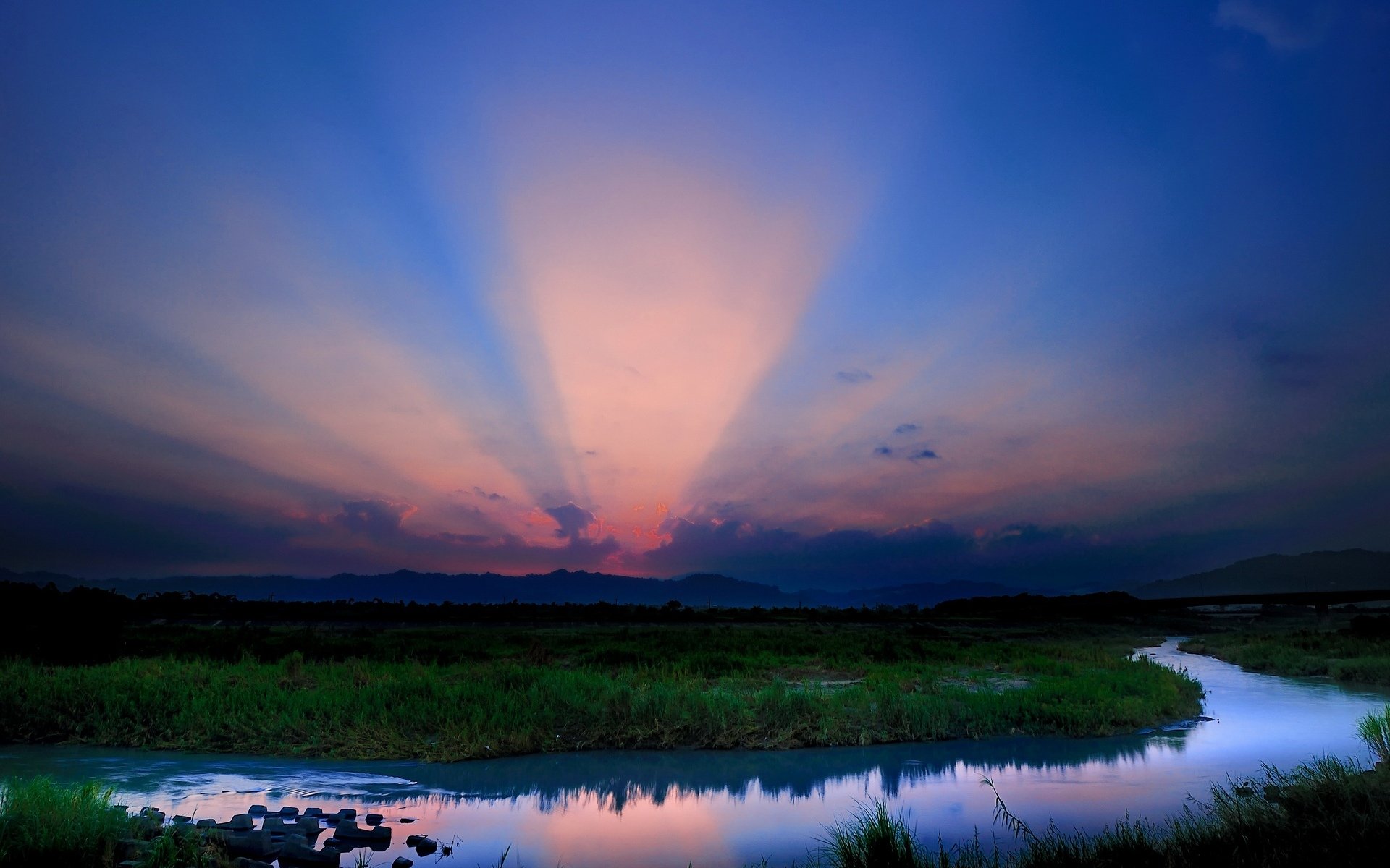 Nubes rosadas en el fondo de la superficie azul del lecho del ríoNubes Rosadas en el fondo de la superficie azul del lecho del río