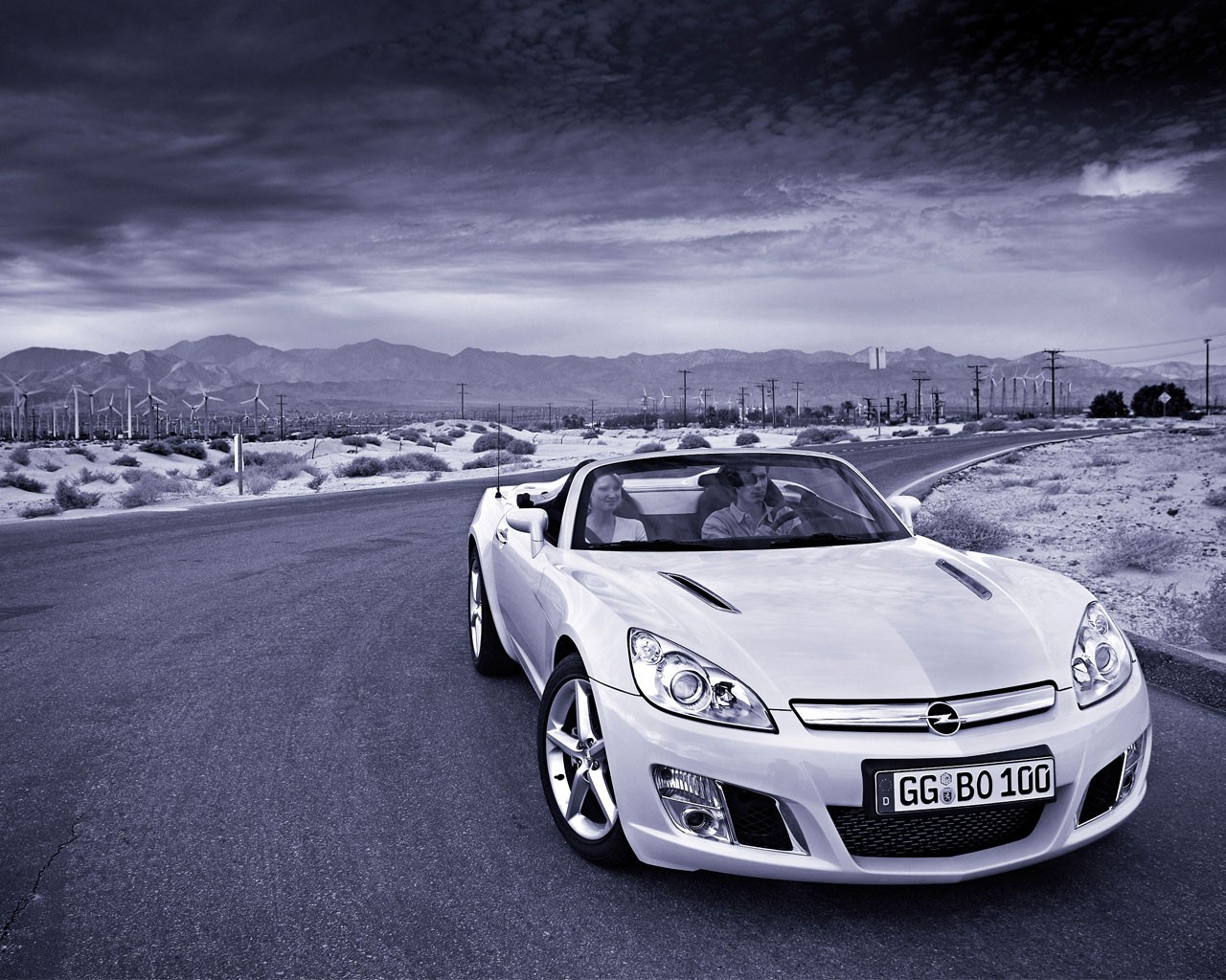 Un Opel convertible viaja a lo largo de los molinos de viento