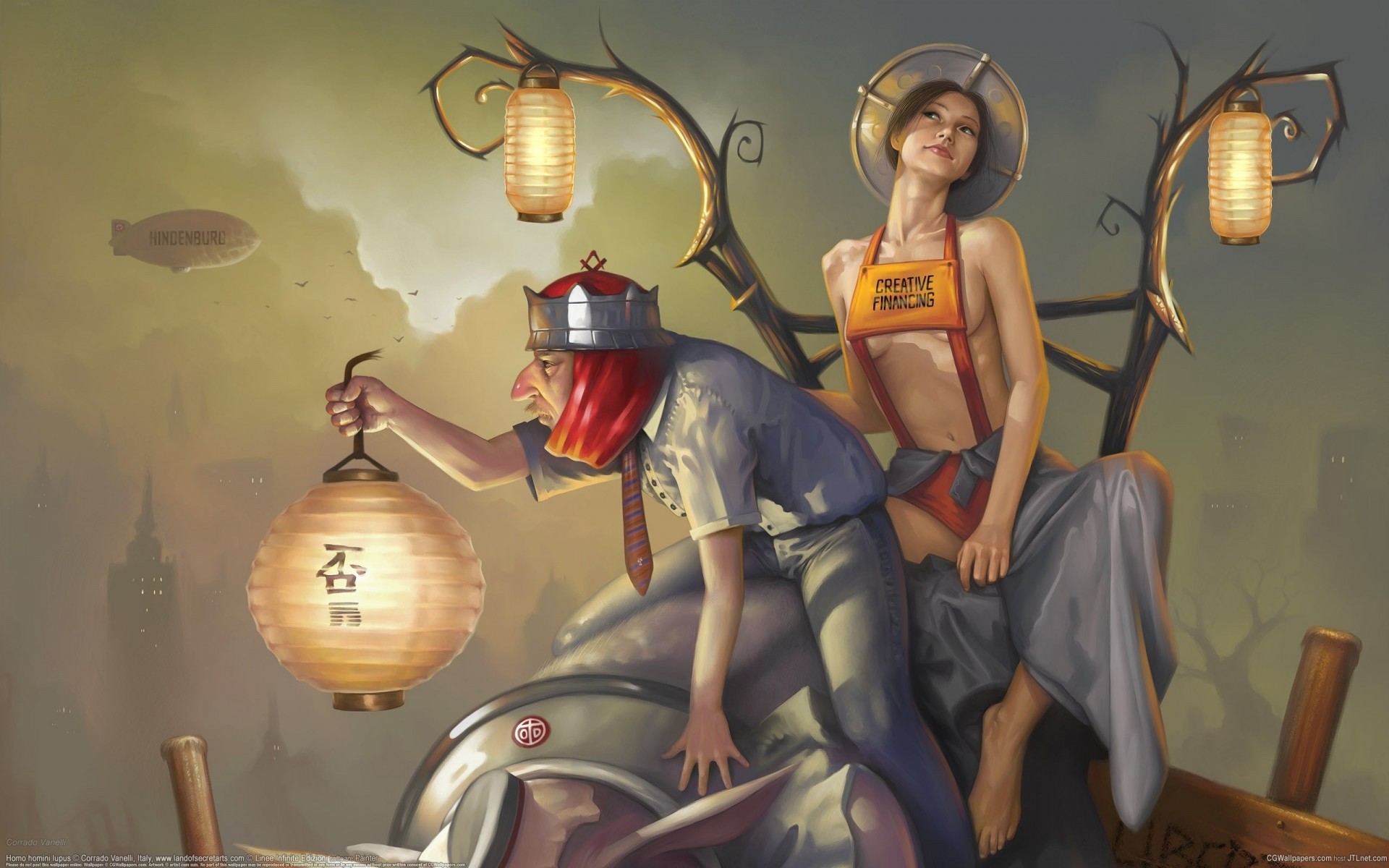 Un hombre jorobado con un burka y una corona con una linterna china ilumina el camino para una chica de ensueño orgullosa y audaz con un sombreroUn hombre jorobado con un burka y una corona con una linterna China ilumina el camino para una chica de ensueño orgullosa y audaz con un sombrero