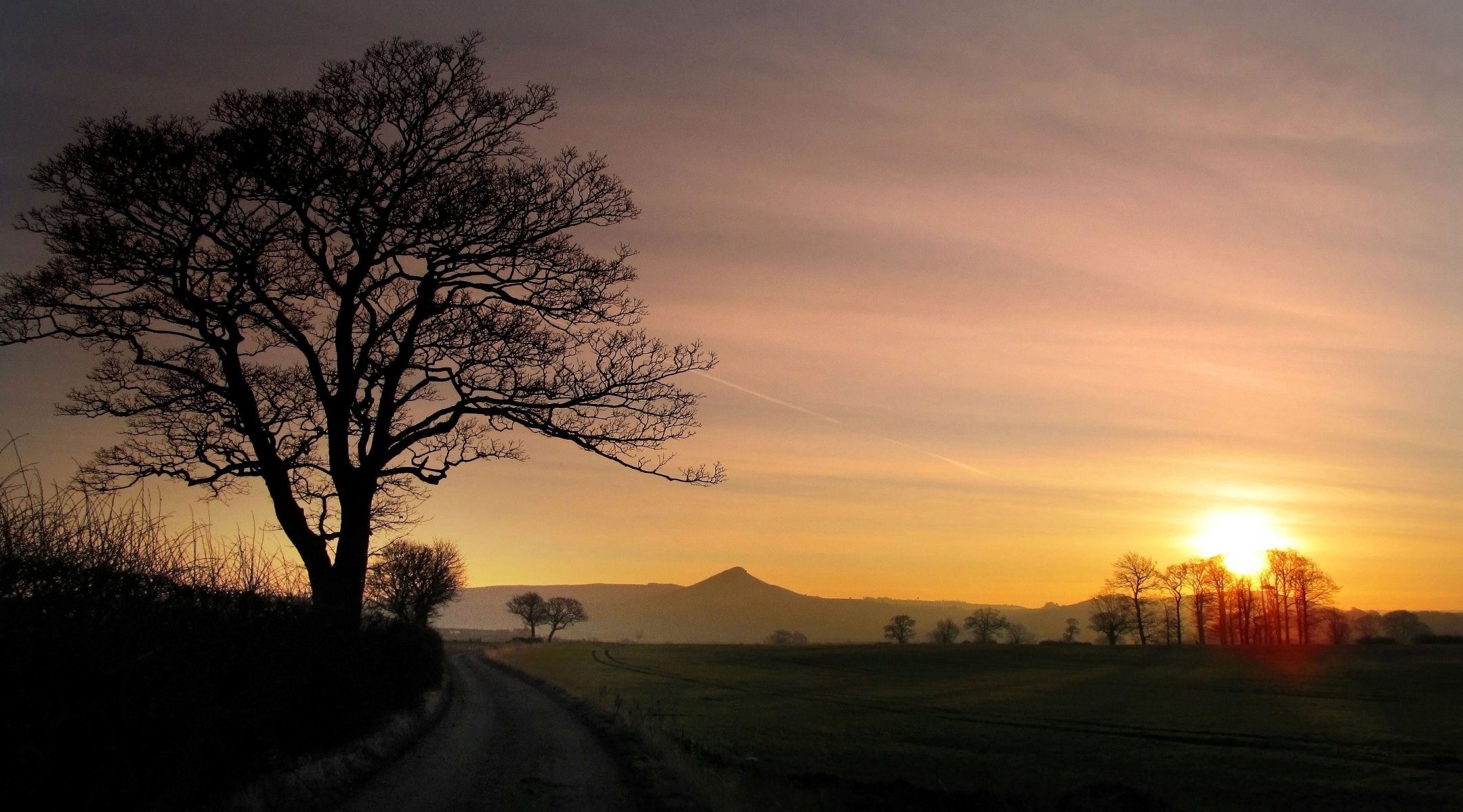 Paisaje con árboles y montañas al atardecer