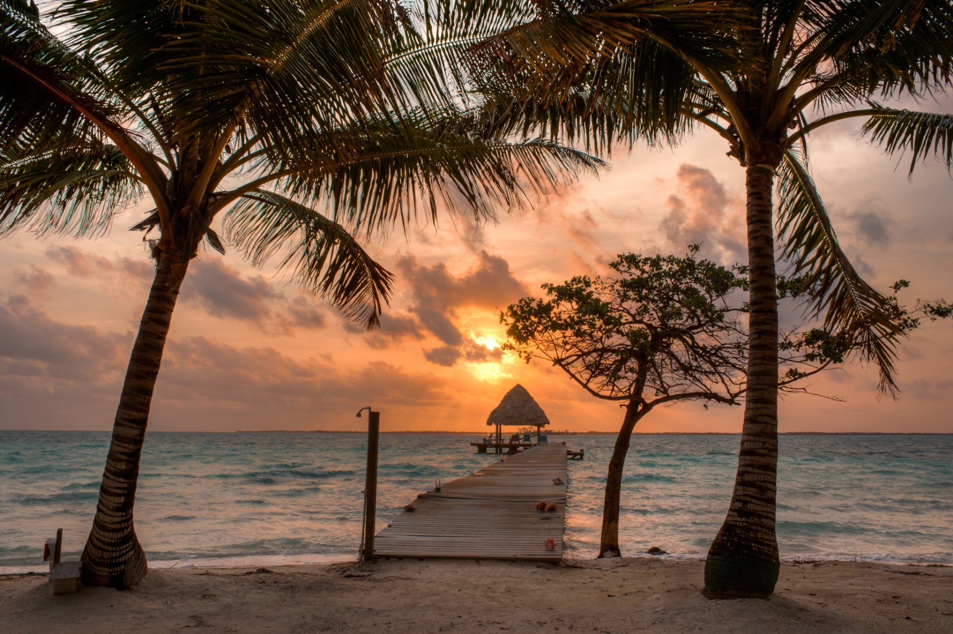 Una rama de palma en el fondo de la playa y el marUna rama de palma en el fondo de la playa y el mar