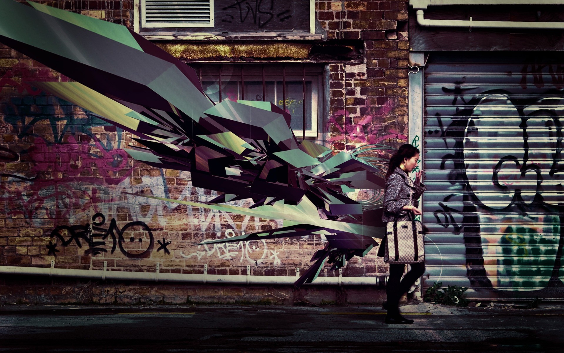 Chica en el fondo de una pared pintada de graffitiChica en el fondo de una pared pintada de graffiti