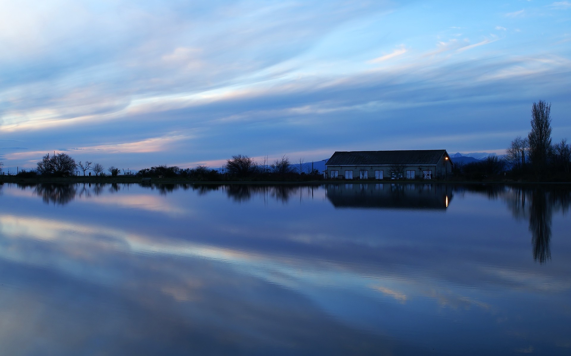 Lago por la noche. edificio en el reflejo del cuerpo de aguaLago por la noche. Edificio en el reflejo del cuerpo de agua