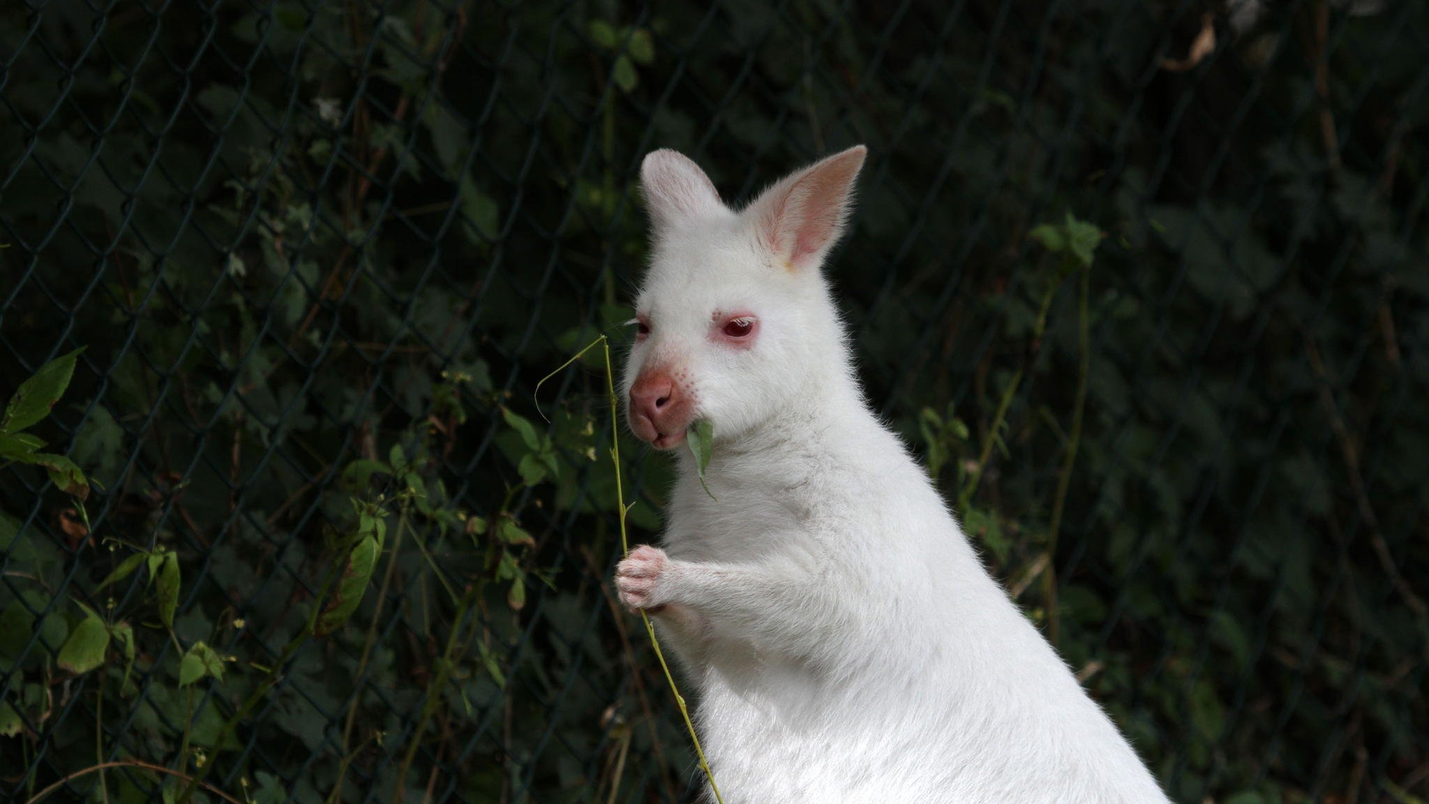 Canguro blanco sostiene una hoja en pequeñas patasCanguro blanco sostiene una hoja en pequeñas patas