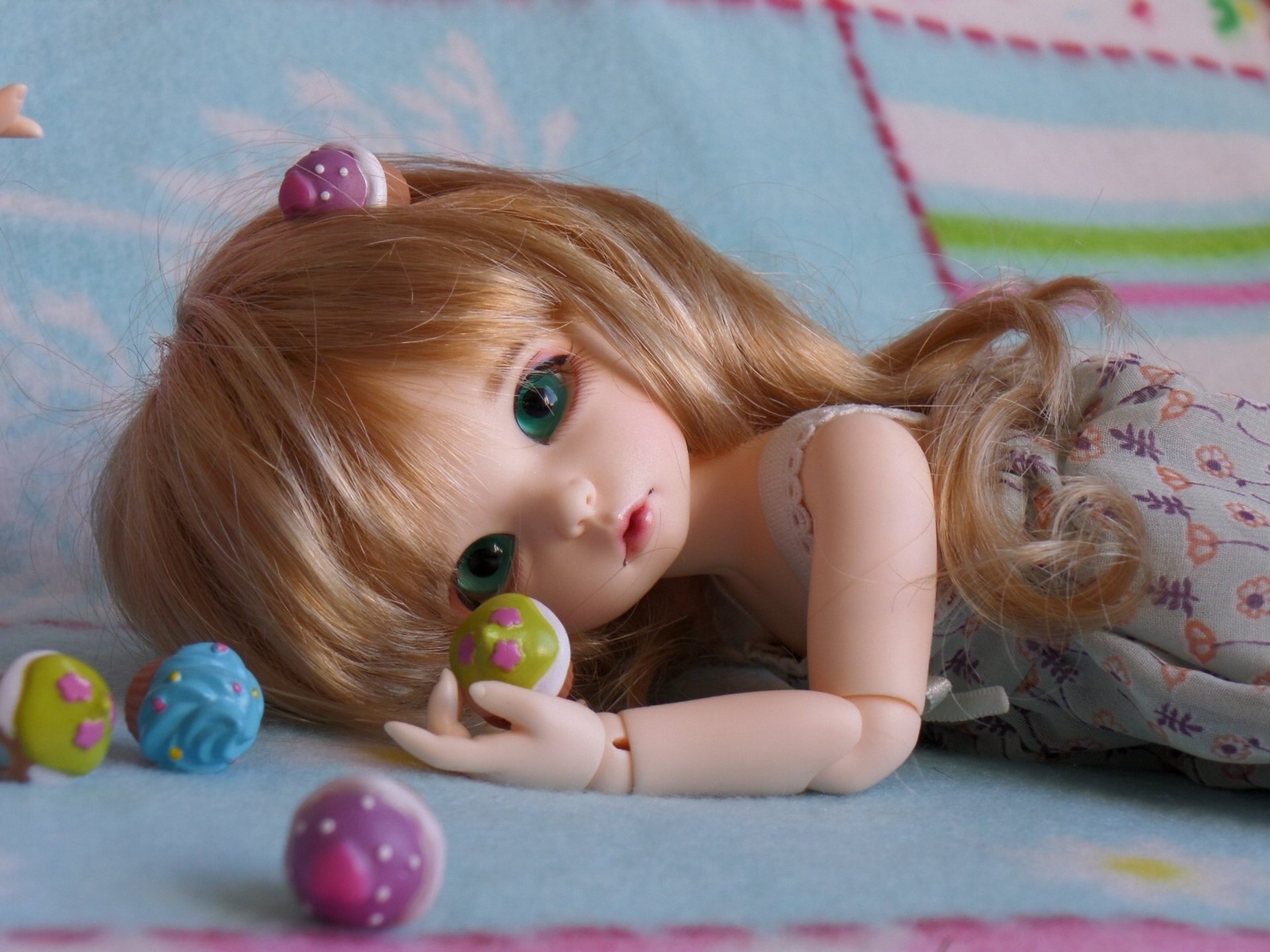Una muñeca con un broche en el pelo se sienta en una pizarraUna muñeca con un broche en el pelo se sienta en una pizarra