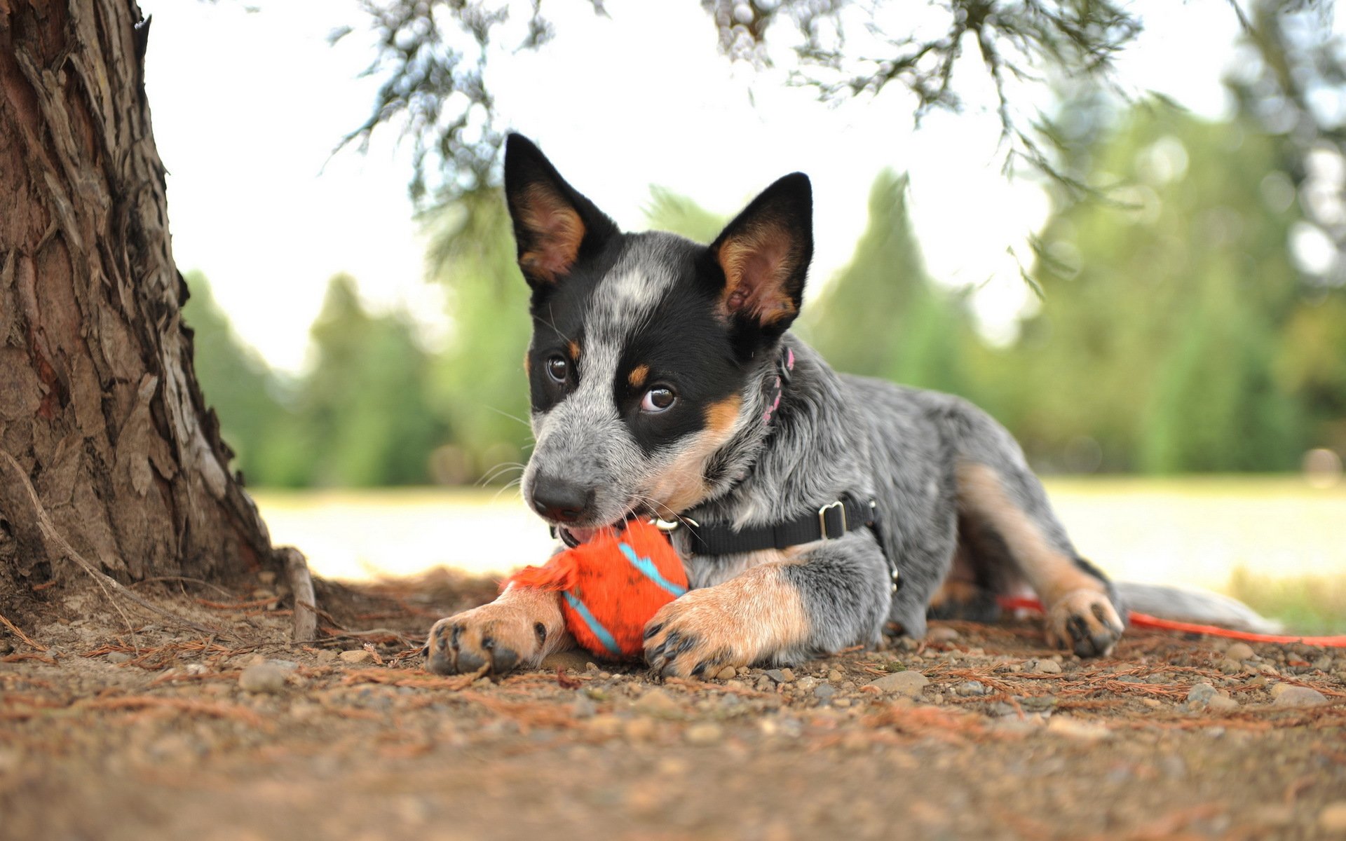 Un perro juega con una pelota cerca de un árbol