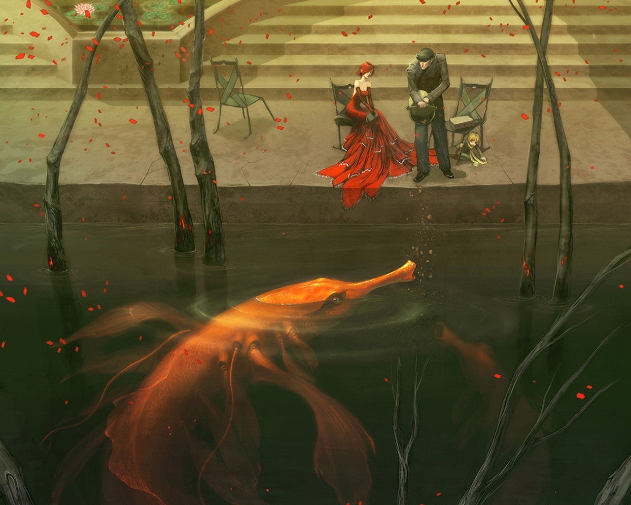 Un hombre y una mujer en la orilla de un estanque con enormes pecesUn hombre y una mujer en la orilla de un estanque con enormes peces