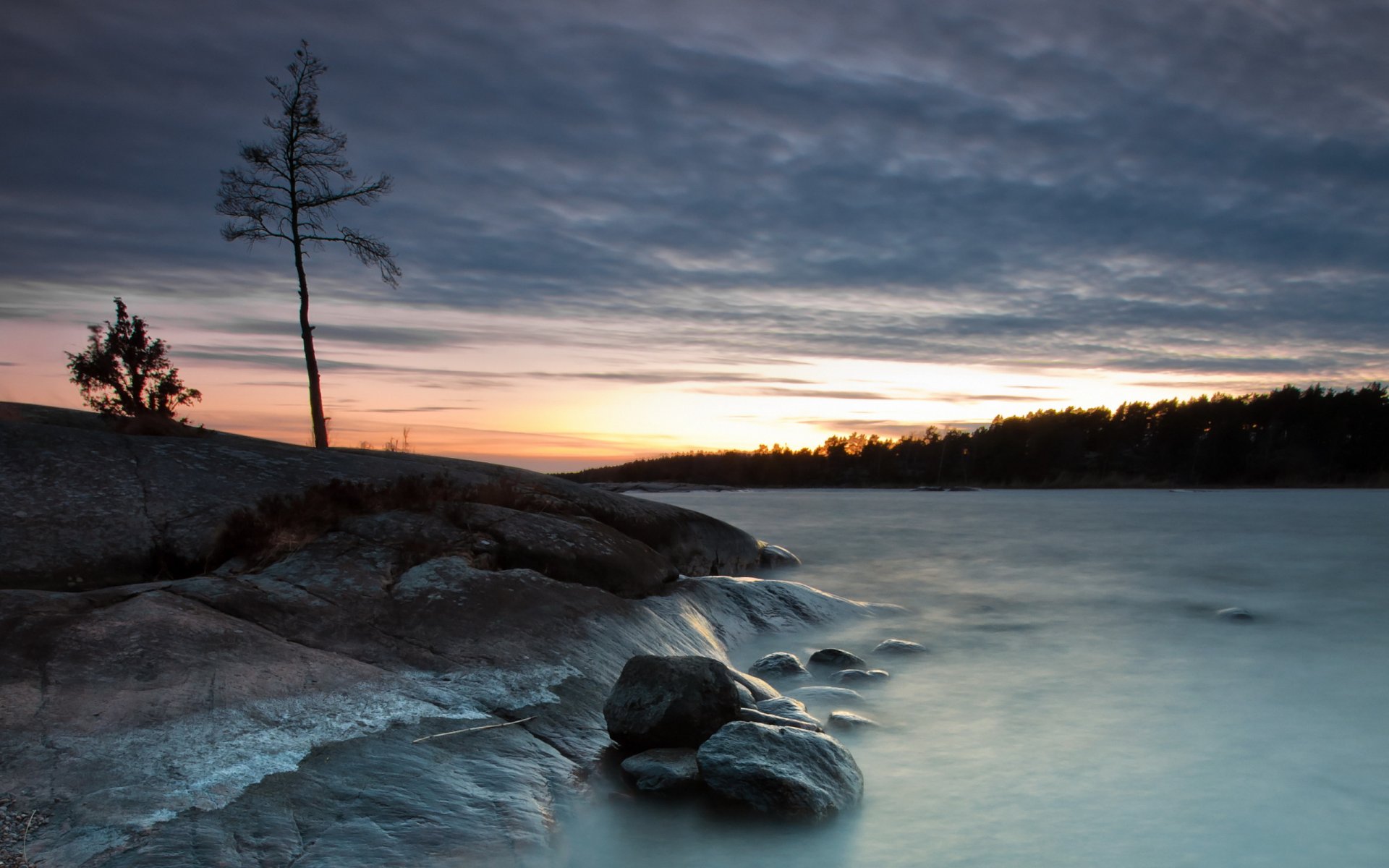 Es una buena foto. Un árbol solitario en la orilla. Cúmulos en el cielo
