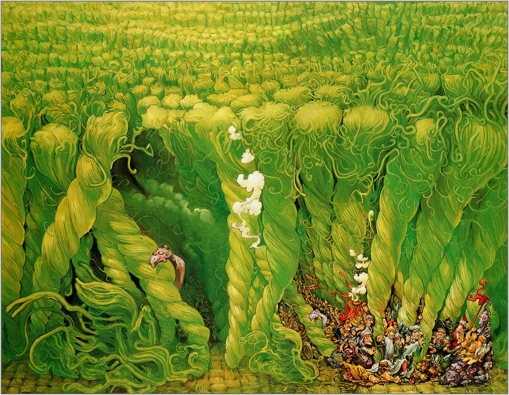 Un claro de dientes de león se encuentra con los rayos del sol desde detrás de los densos pinosUn claro de dientes de León se encuentra con los rayos del sol desde detrás de los densos pinos