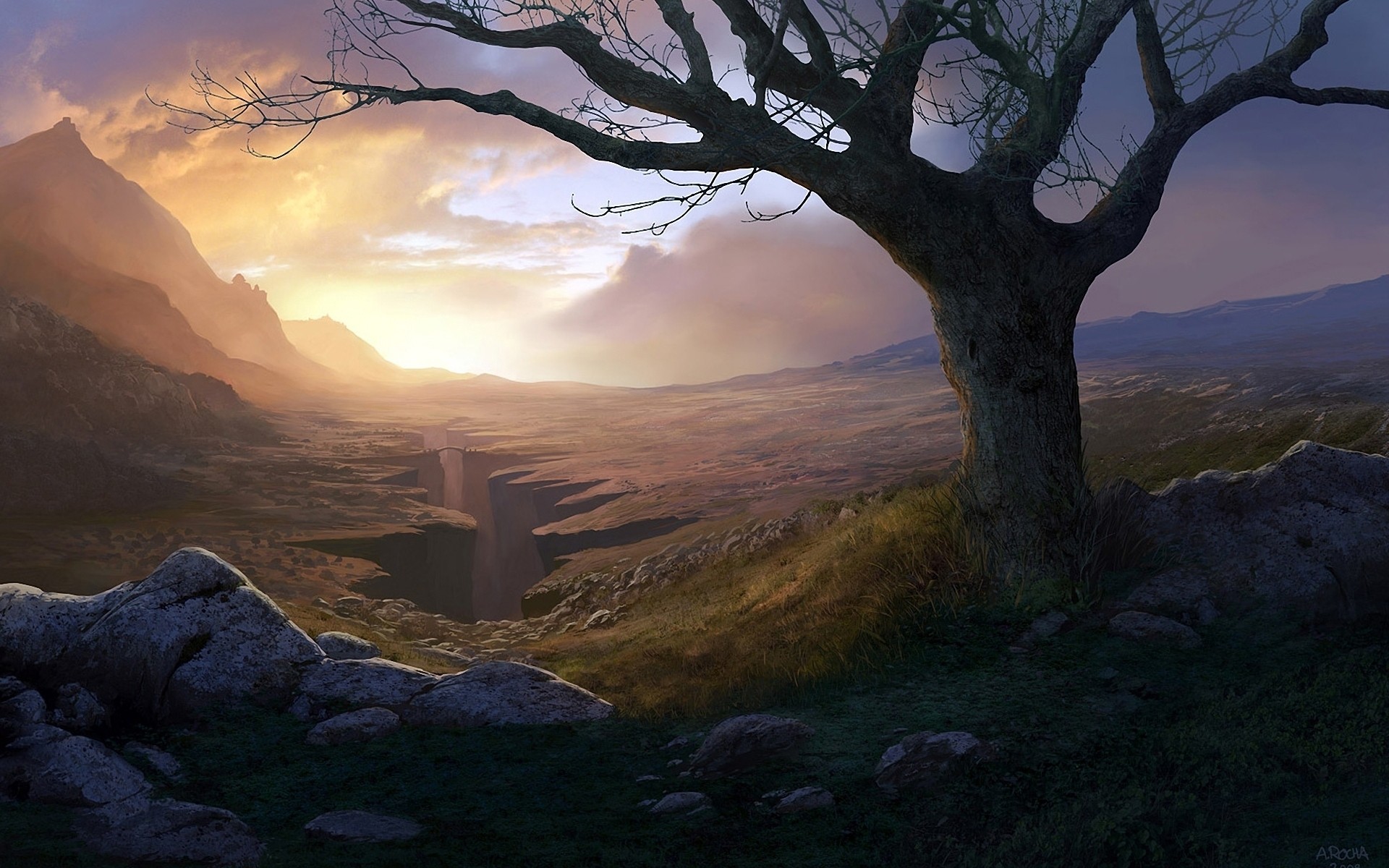 Pintura con el paisaje del lago y los árboles en el fondo de la puesta de solPintura con el paisaje del lago y los árboles en el fondo de la puesta de sol